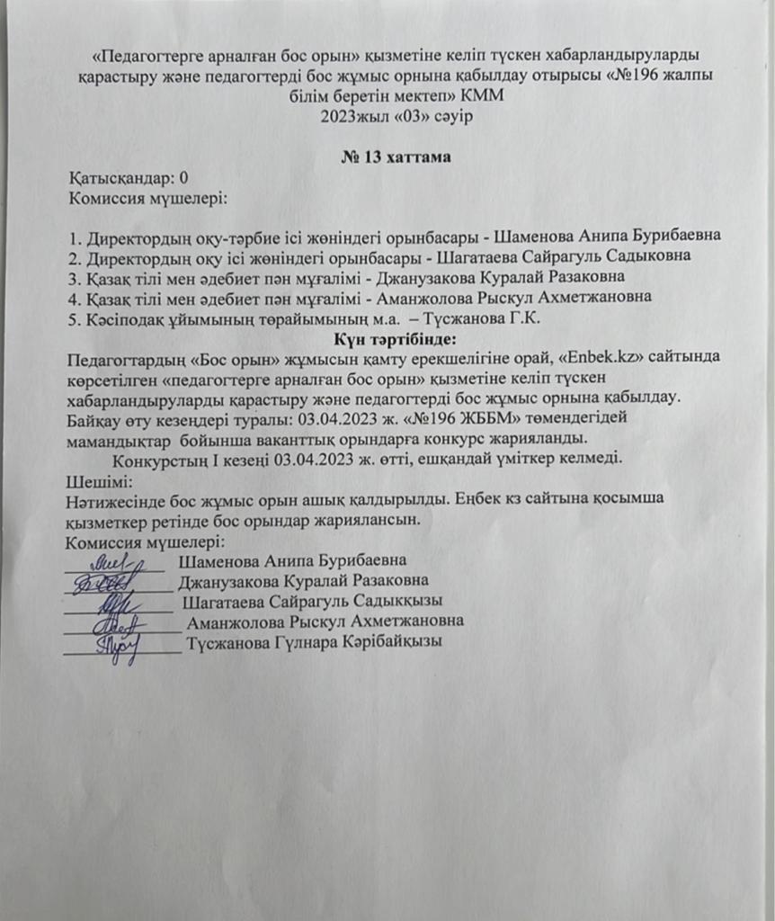 Педагогтерге арналған бос жұмыс орнына қабылдау. Хаттама № 13