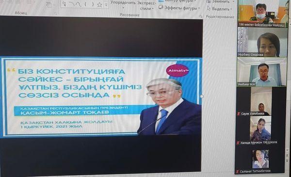 Қазақстан Республикасының Президенті Қ.К. Тоқаевтың 2021 жылғы қыркүйектегі “Халық бірлігі және жүйелі реформалар-ел өркендеуінің берік негізі”атты Қазақстан халқына Жолдауына байланысты мектеп ұжымы арасында отырыс өтіп талқыланды