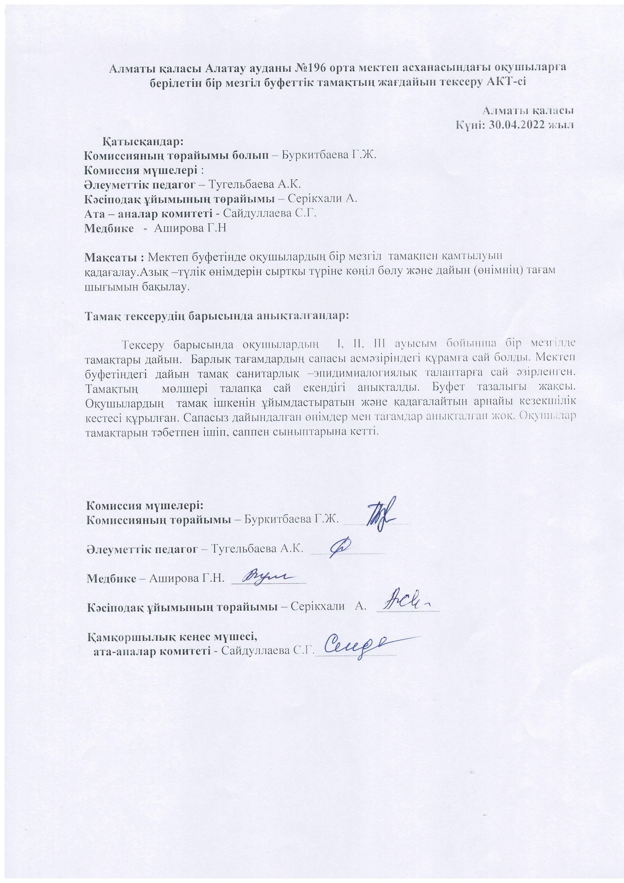 » Алматы қаласы Алатау ауданы №196 орта мектеп асханасындағы оқушыларға берілетін бір мезгіл буфеттік тамақтың жағдайын тексеру АКТ-сі
