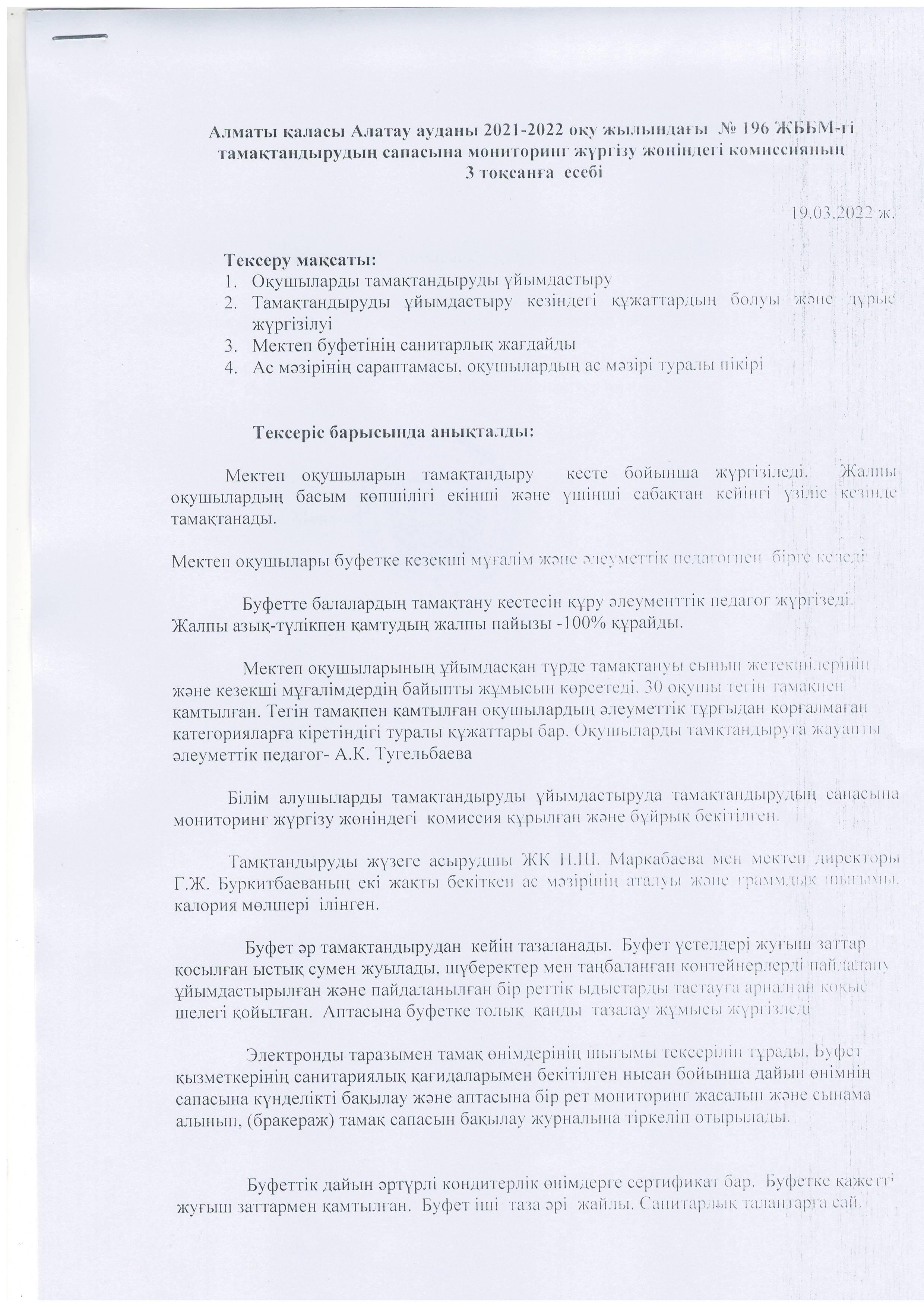 2021-2022 оқу жылындағы № 196 ЖББМ-гі тамақтандырудың сапасына мониторинг жүргізу жөніндегі комиссияның 3 тоқсанға есебі