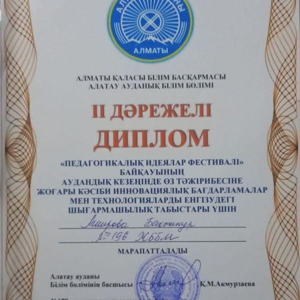 “Педагогикалық идеялар фестивалі” байқауының аудандық кезеңінде өз тәжірибесіне жоғары кәсіби инновациялық бағдарламалар мен технологияларды енгізудегі шығармашылық табыстары үшін мектебіміздің орыс тілі мен әдебиеті пәні мұғалімі - Аширова Бахтинур марапатталды