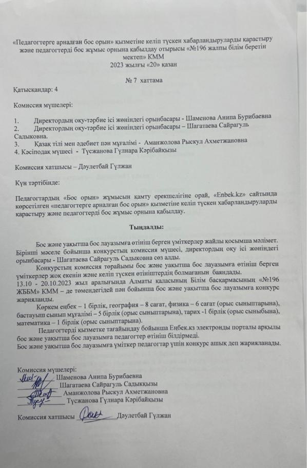 20 октябрь 2023 0 1 2 3 4 5 Педагогтерге арналған бос және уақытша бос жұмыс орнына конкурс. Хаттама № 7