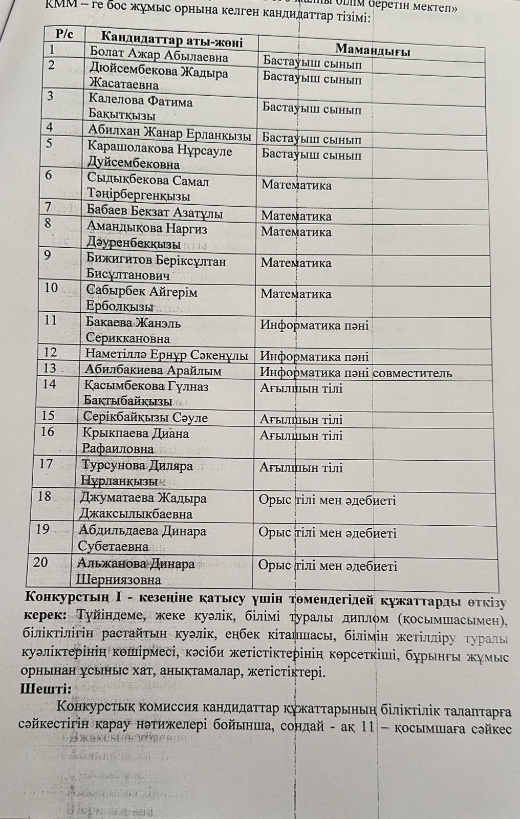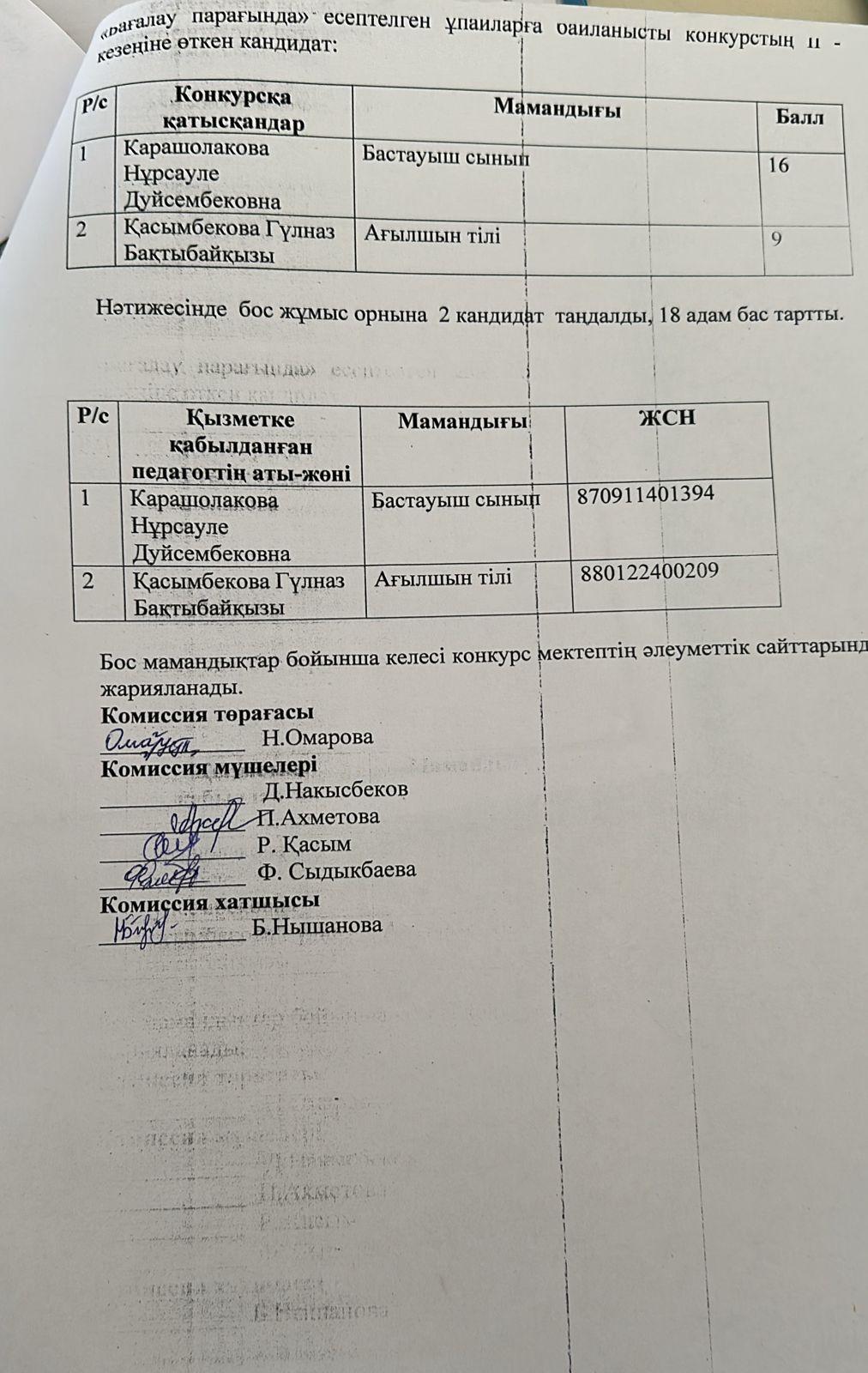 Бос және уақытша бос орынға педагогтерді қабылдау. Хаттама №2