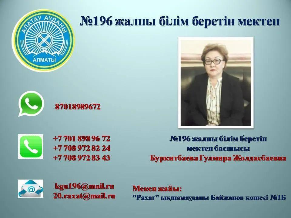 Құрметті N196 жалпы білім беретін мектептің ата-аналары! Мектептің оқу- тәрбие үрдісі бойынша сұрақтарыңыз болса тікелей байланысқа шығып, туындаған сұрақтарыңызға жауап алуларыңызға болады.