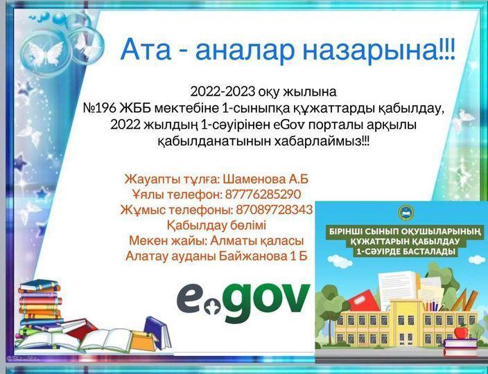 2022 жылдың 1 сәуірінен бастап қаланың бірінші сыныптарына қабылдау басталады. Мемлекет меншігіндегі орта білім беру ұйымдарына қабылдау электрондық нұсқада https://egov.kz/ электрондық үкімет порталында жүргізіледі.