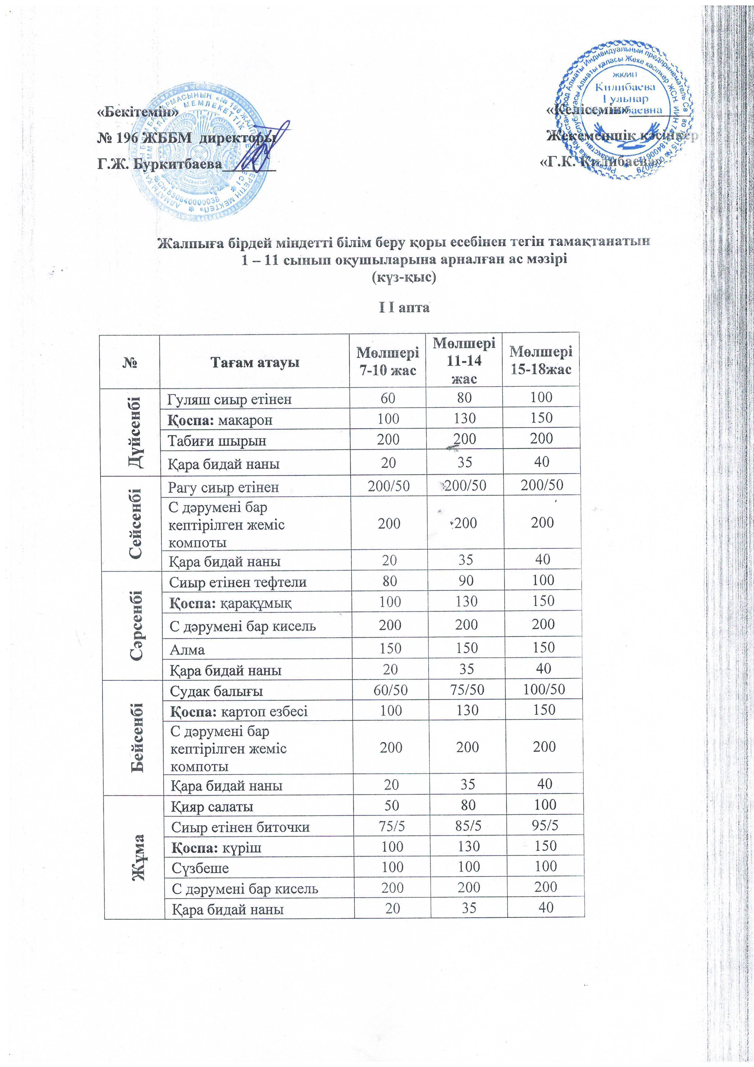 №196 мектеп » Ақпарат » Жалпыға бірдей міндетті білім беру қоры есебінен тегін тамақтанатын 1 - 11 сынып оқушыларына арналған ас мәзірі (күз-қыс)