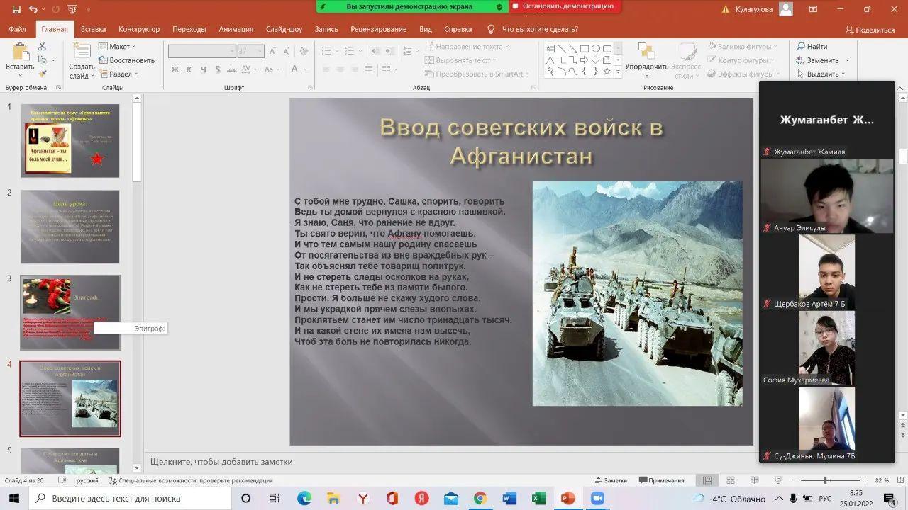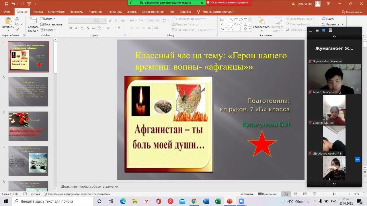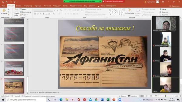 02.02.2022 жыл. Алатау ауданы N196 жалпы білім беретін мектептің 7"Б"сынып оқушылары АУҒАН СОҒЫСЫНЫҢ АРДАГЕРЛЕРІНЕ ТАҒЗЫМ! атты қашықтықтан сынып сағатын өткізді. Ауған оқиғасының тарихи мағынасын аша отырып, соғыс ардагерлері туралы мәлімет беру, тарихи деректердің маңызды екендігін ұғындыру, Тәуелсіздік жолында күрескен аға-апаларымыздың ерлігін мақтаныш ете отырып, оқушыларды ұлтжандылыққа, Отанын сүюге тәрбиелеу мақсатында өткен сынып сағатында жылдар өткенімен жауынгерлеріміздің өшпес ерлігі ел есінде сақталатынын , бүгін де біз бейбіт елдің жастары, еліміздің сол соғысқа қатысқан ұлдарын, Отан алдындағы борыштарын адал атқарған азаматтарымызды құрмет тұтуға міндетті екенімізді оқушыларға түсіндіру болды.Ел тыныштығы үшін, бірлік үшін соғысқа қатысқан ардагер ағаларымызды құрмет етіп, ерлігін жырға қосып, есімдерін естен шығармау үшін жас ұрпақтың бойына ерлік, адалдық, адамгершілік қасиеттерді сіңіріп келе жатқан ұстаздар осылай шәкірттерін патриоттық рухта тәрбиелеп келеді.