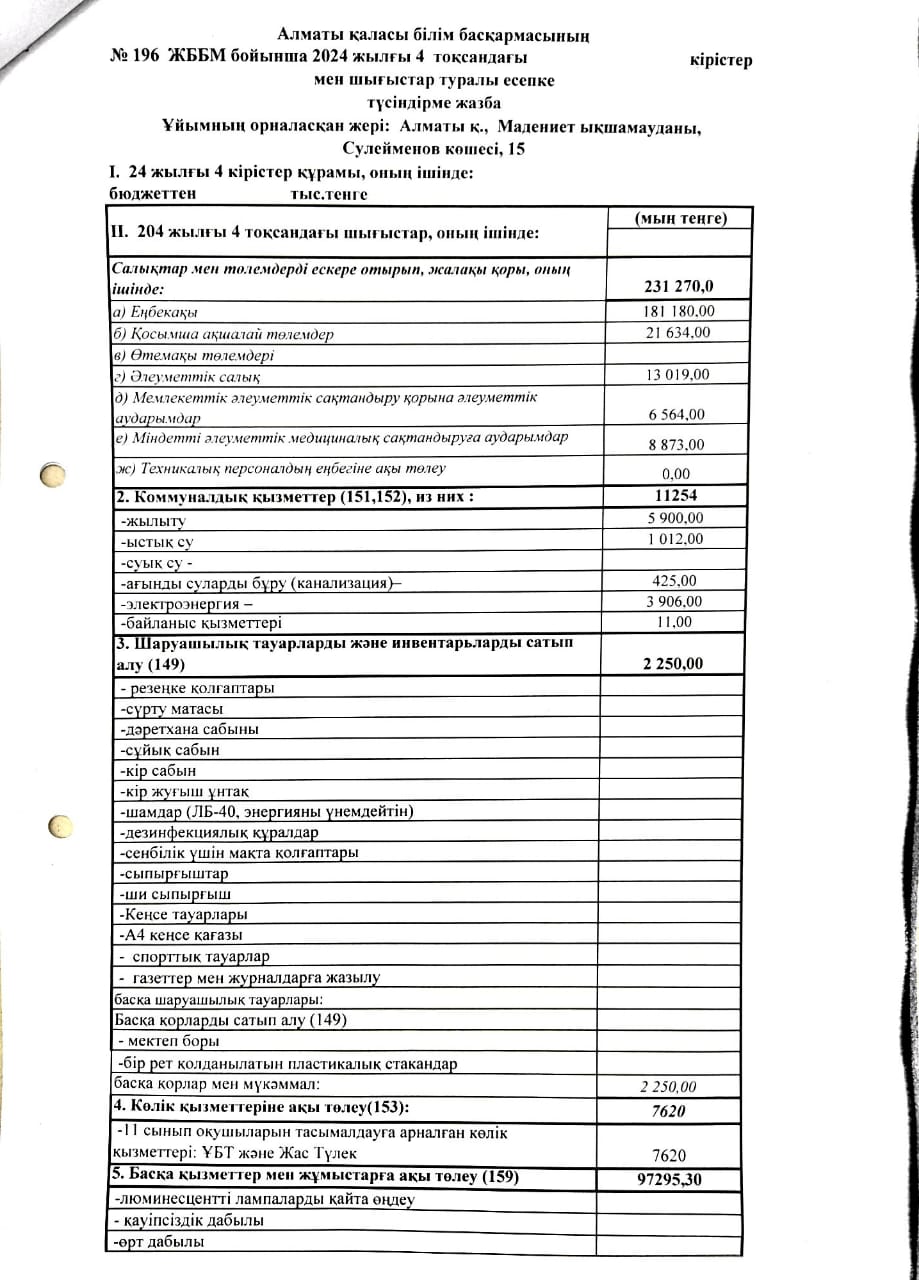 » 2024 жылдың 4 тоқсандағы кірістер мен шығыстар туралы есеп