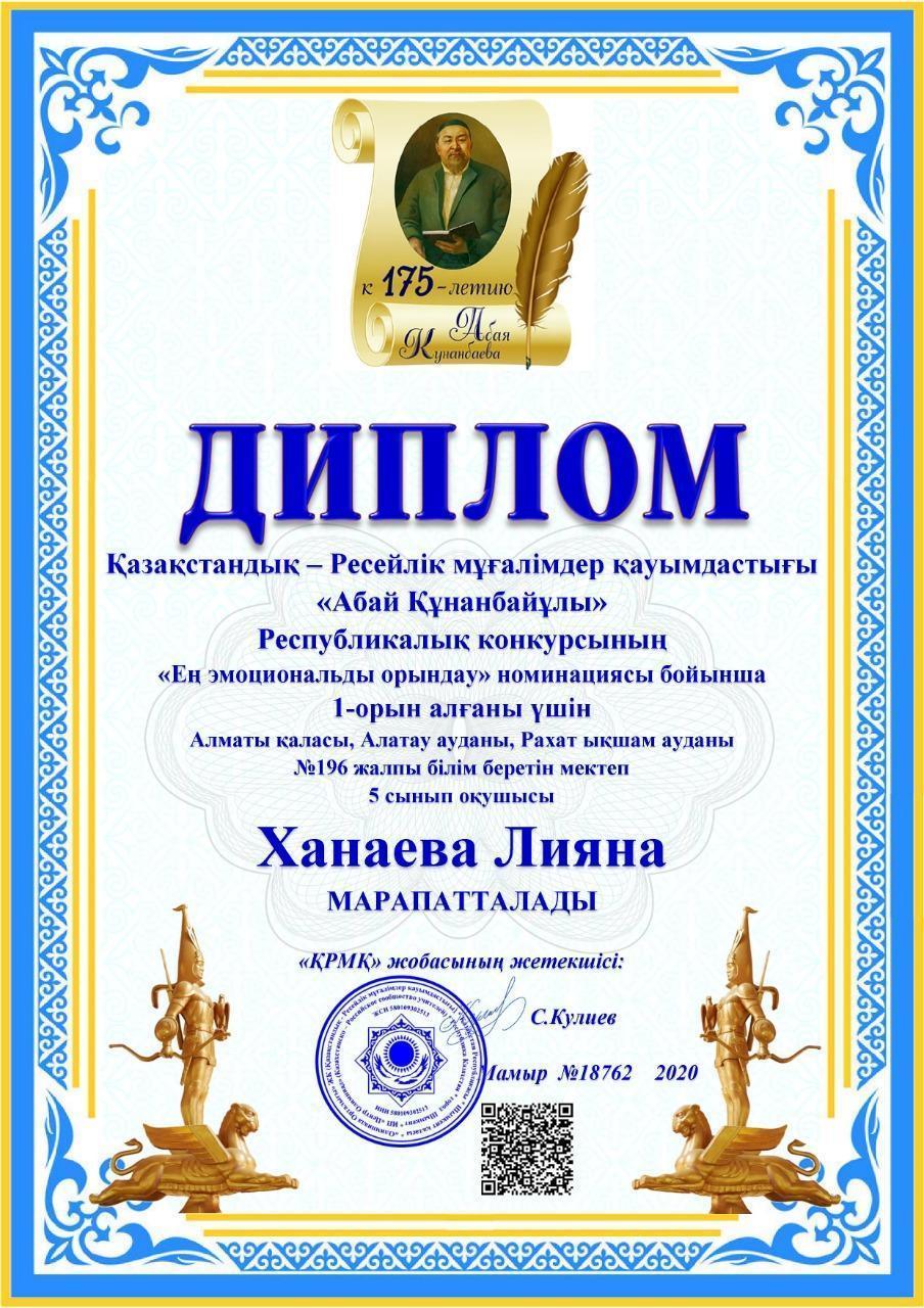 Алматы қаласы Алатау ауданы N196 жалпы білім беретін мектеп оқушылары қашықтықтан өткізіліп жатқан байқаулар мен олимпиадаларға қатысып жүлделі І, ІІ, ІІІ орын иегерлері атанып, ұстаздарының үмітін ақтап, марапатталды. https://web.facebook.com/100025697012822/videos/635722130627682/