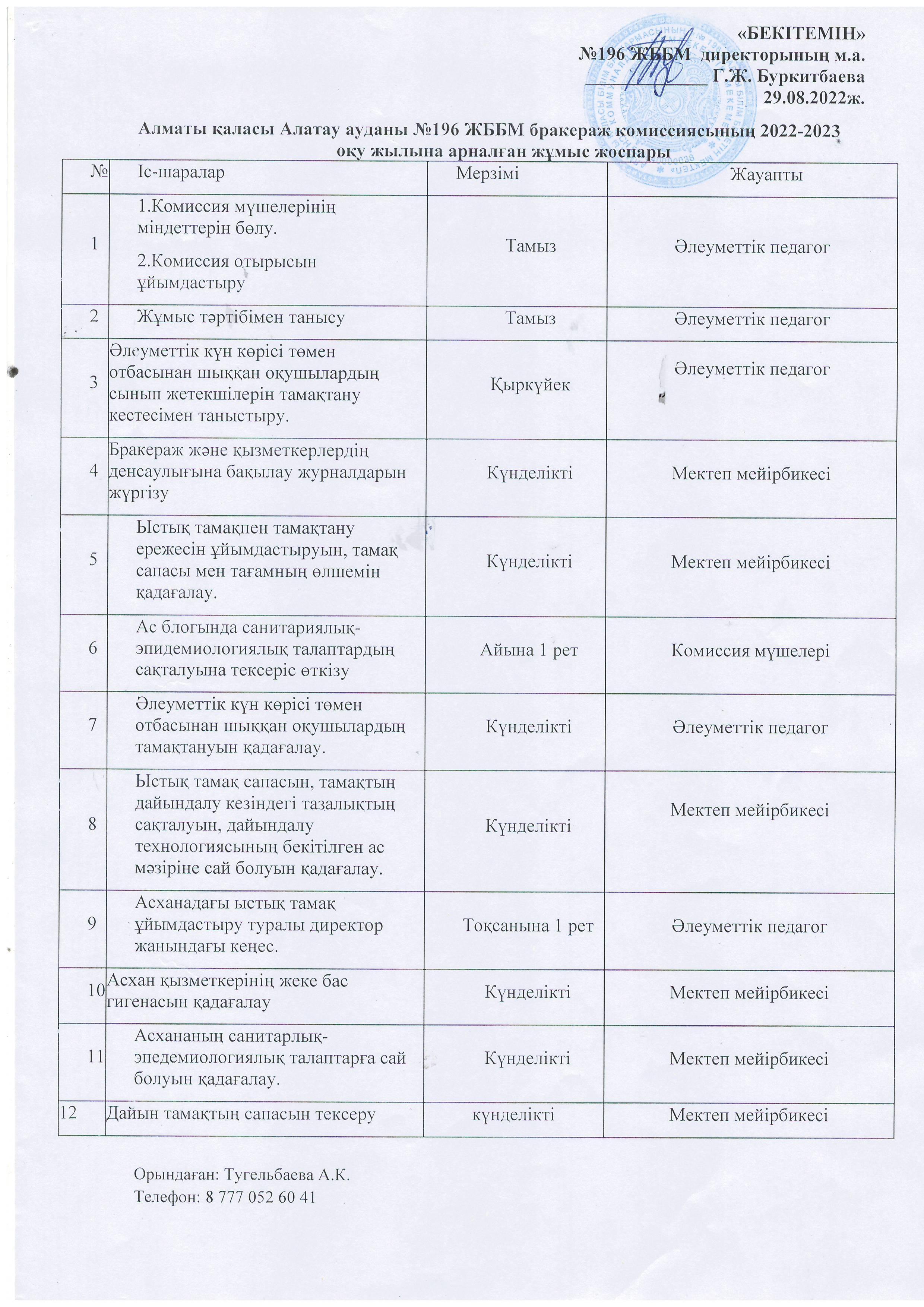 Алматы қаласы Алатау ауданы №196 ЖББМ бракераж комиссиясының 2021-2022 оқу жылына арналған жұмыс жоспары
