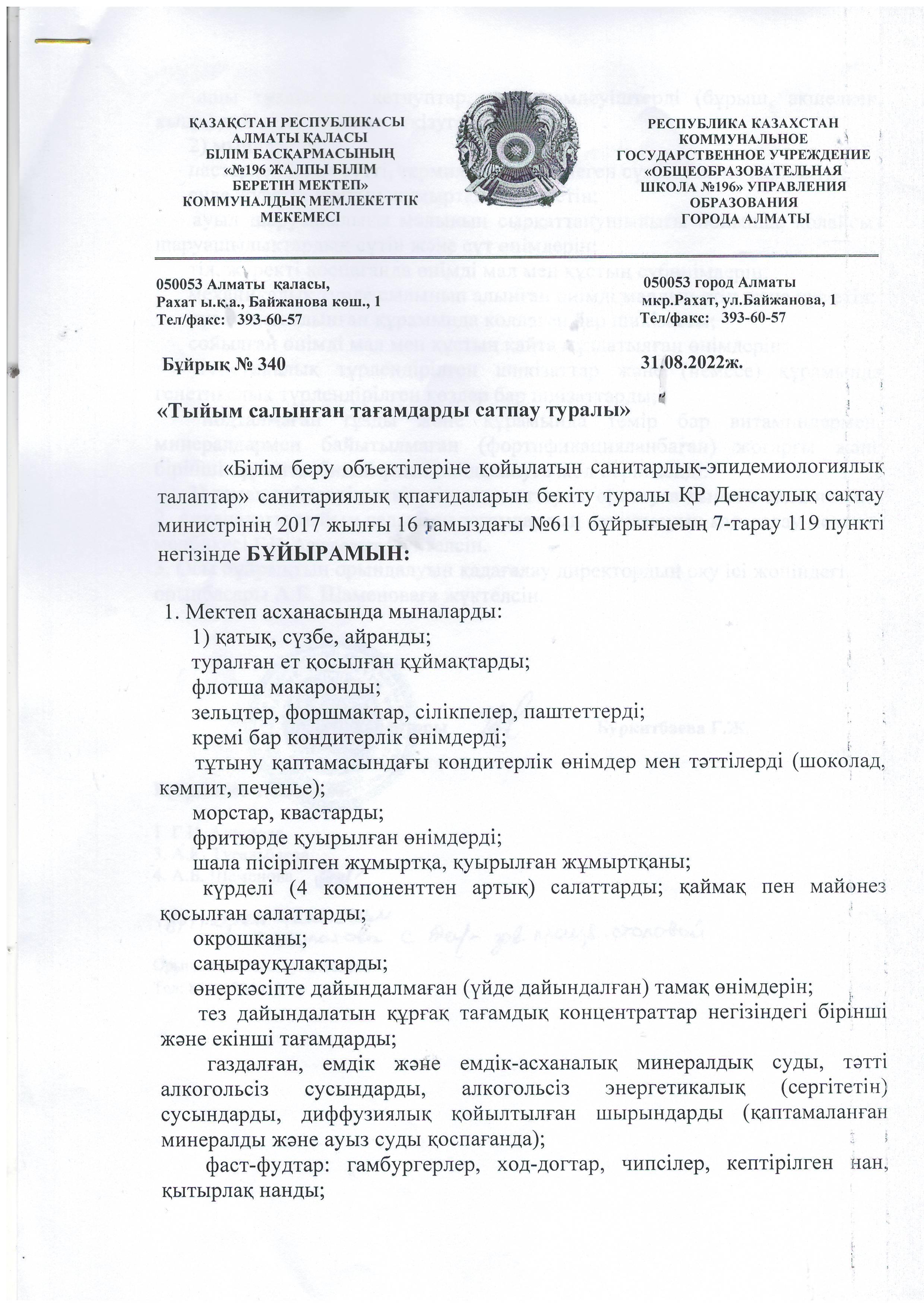 » Тыйым салынған тамақтарды сатпау туралы БҰЙРЫҚ №340