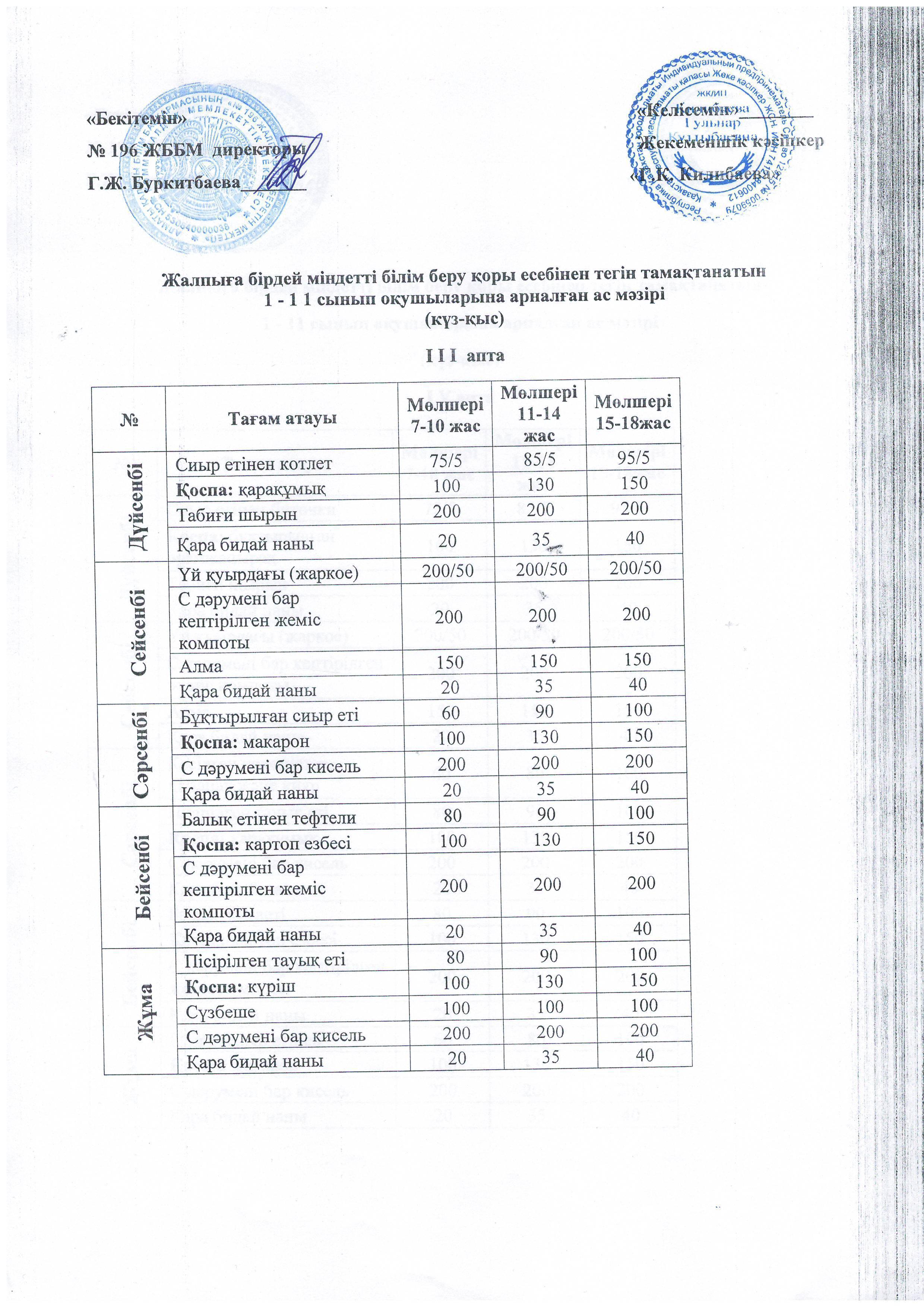 №196 мектеп » Тамақтандыру » 12.10.2022. Жалпыға бірдей міндетті білім беру қоры есебінен тегін тамақтанатын 1 - 1 0 сынып оқушыларына арналған ас мәзірі (күз-қыс) І I I апта