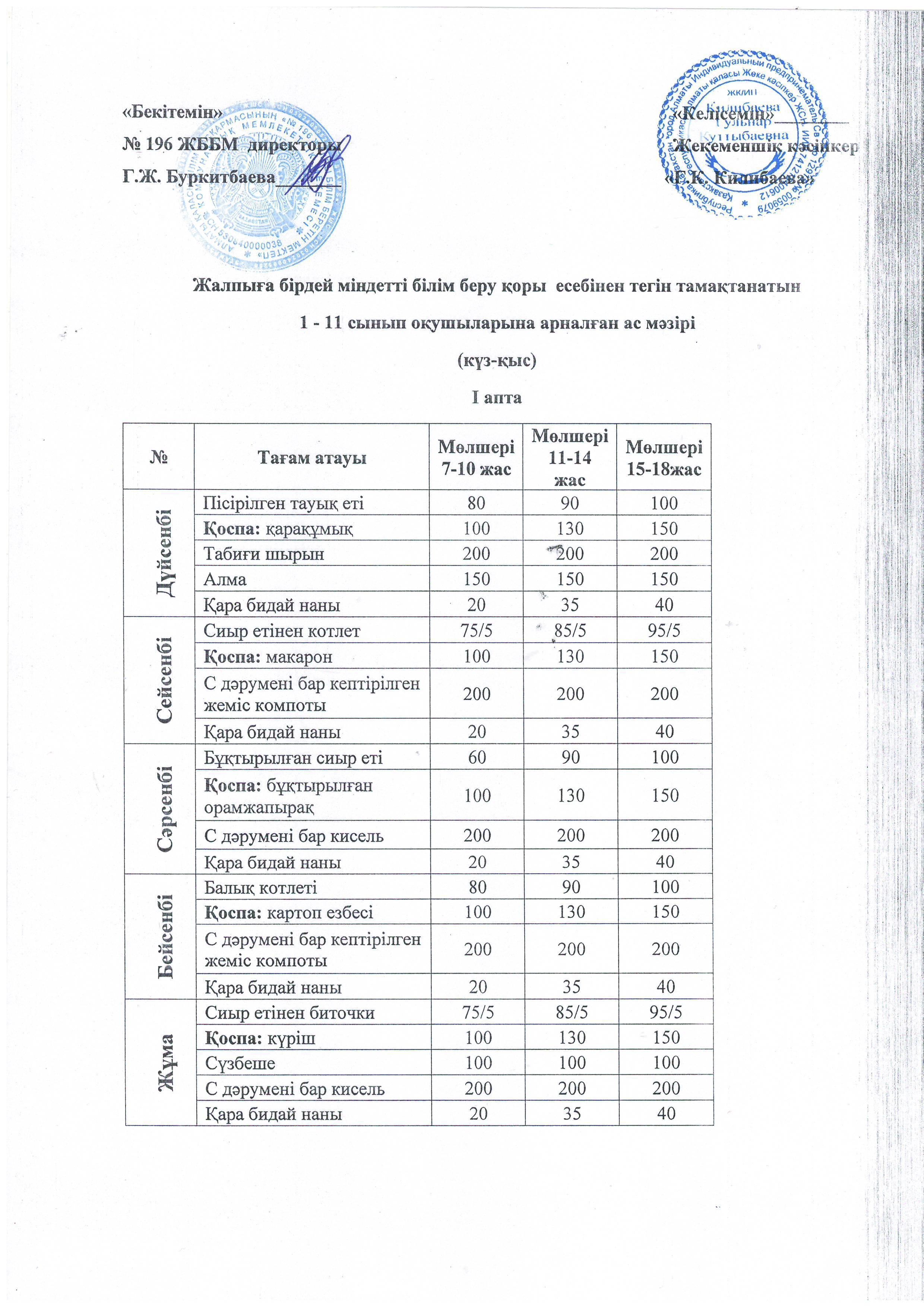 №196 мектеп » Тамақтандыру » 27.10.2022.Жалпыға бірдей міндетті білім беру қоры есебінен тегін тамақтанатын 1 - 10 сынып оқушыларына арналған ас мәзірі (күз-қыс) І апта