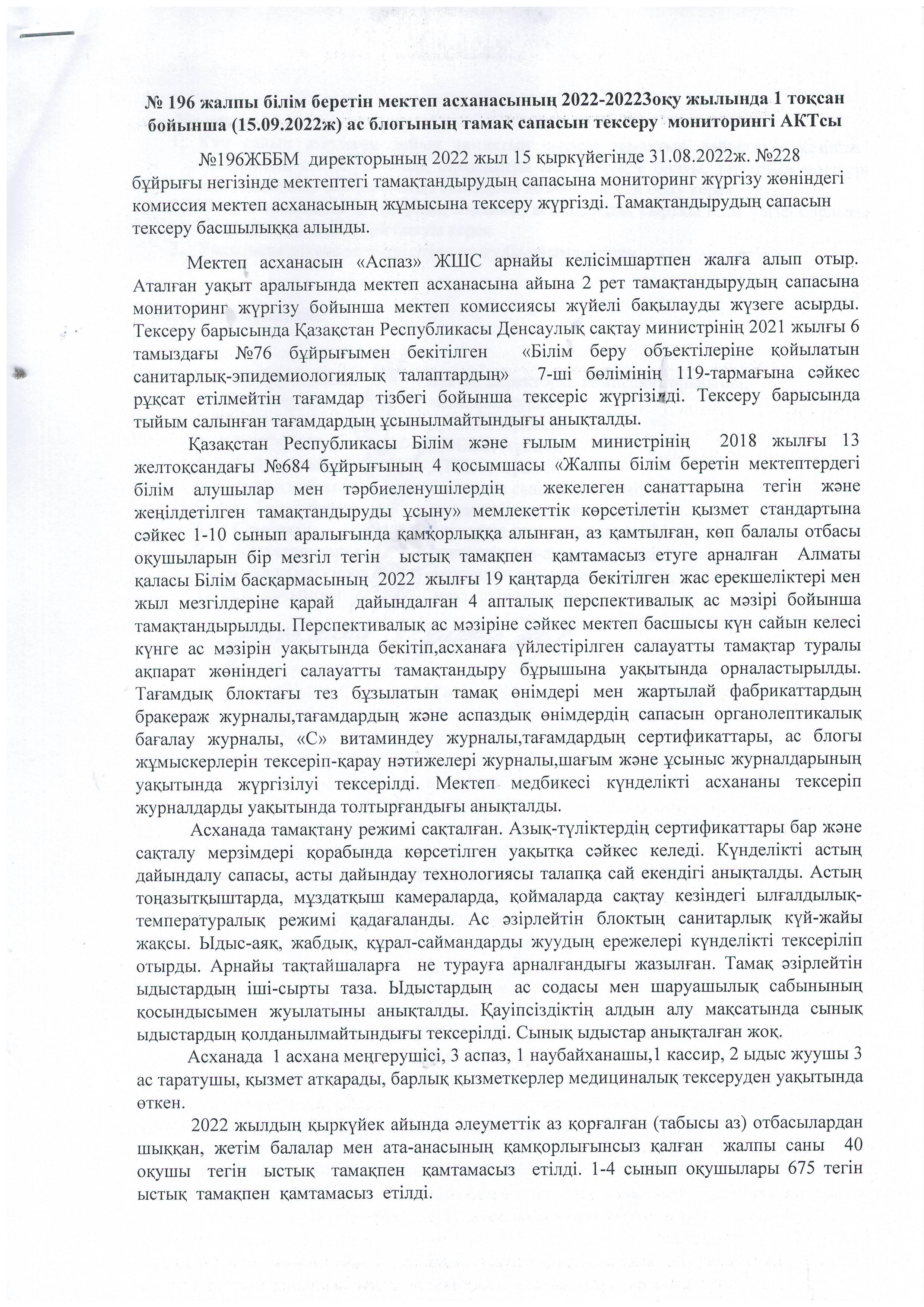 №2 АКТ.№ 196 жалпы білім беретін мектеп асханасының 2022-20223оқу жылында 1 тоқсан бойынша (15.09.2022ж) ас блогының тамақ сапасын тексеру мониторингі АКТсы