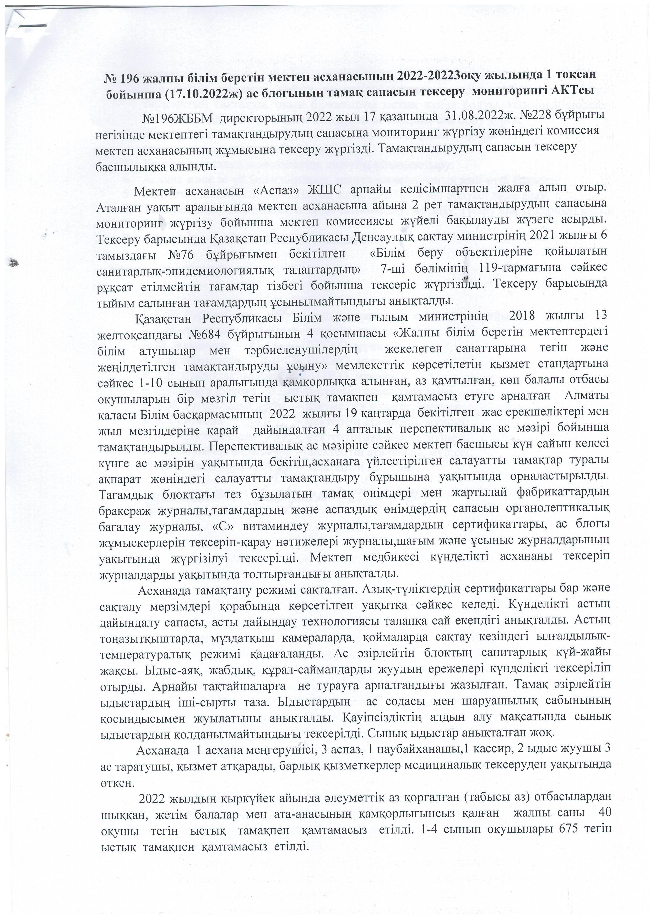 №4 АКТ. № 196 жалпы білім беретін мектеп асханасының 2022-20223оқу жылында 1 тоқсан бойынша (17.10.2022ж) ас блогының тамақ сапасын тексеру мониторингі АКТсы