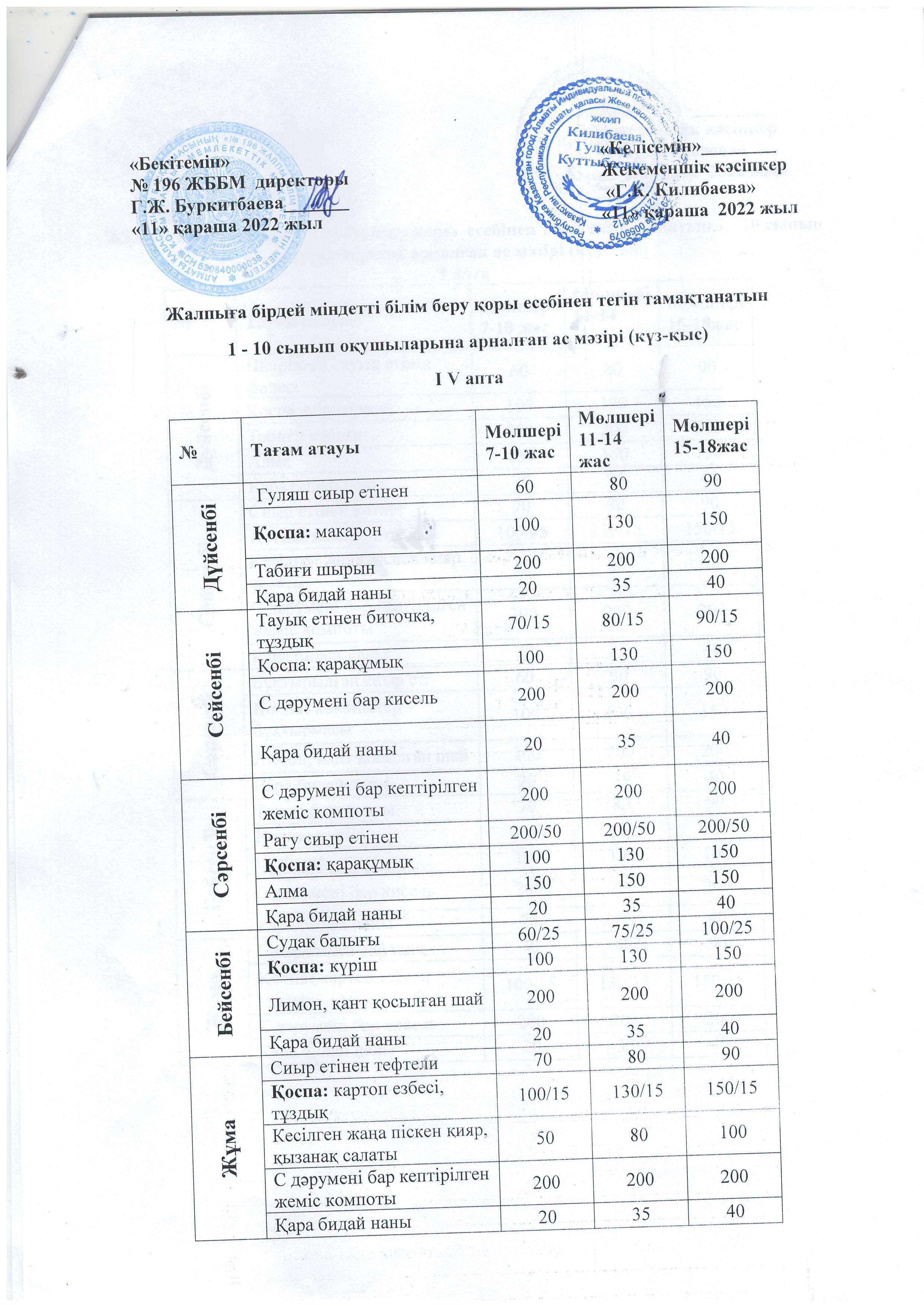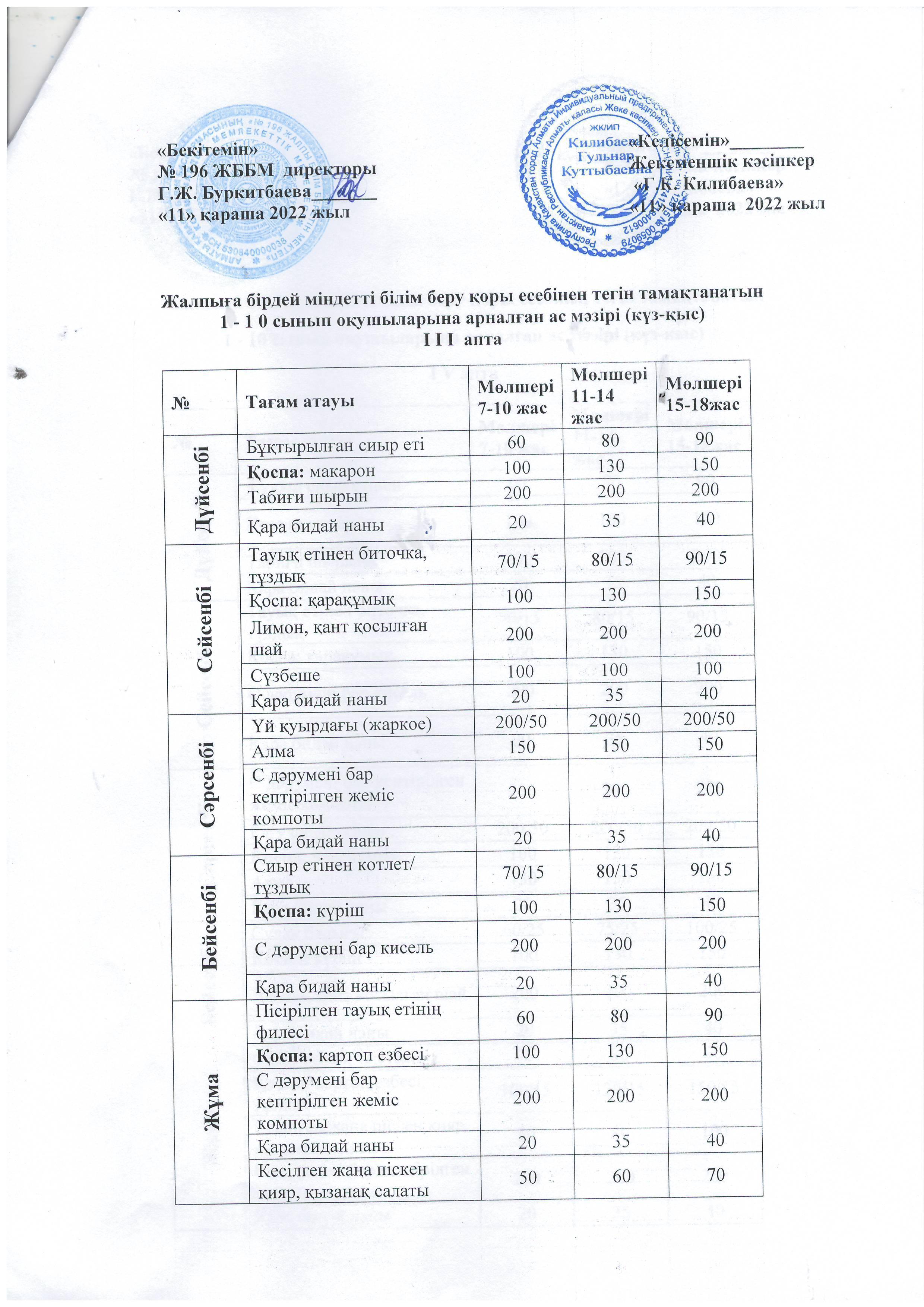 №196 мектеп » Тамақтандыру » ІІ тоқсан. Өзгертілген ас мәзірі. Жалпыға бірдей міндетті білім беру қоры есебінен тегін тамақтанатын 1 - 10 сынып оқушыларына арналған ас мәзірі (күз-қыс)