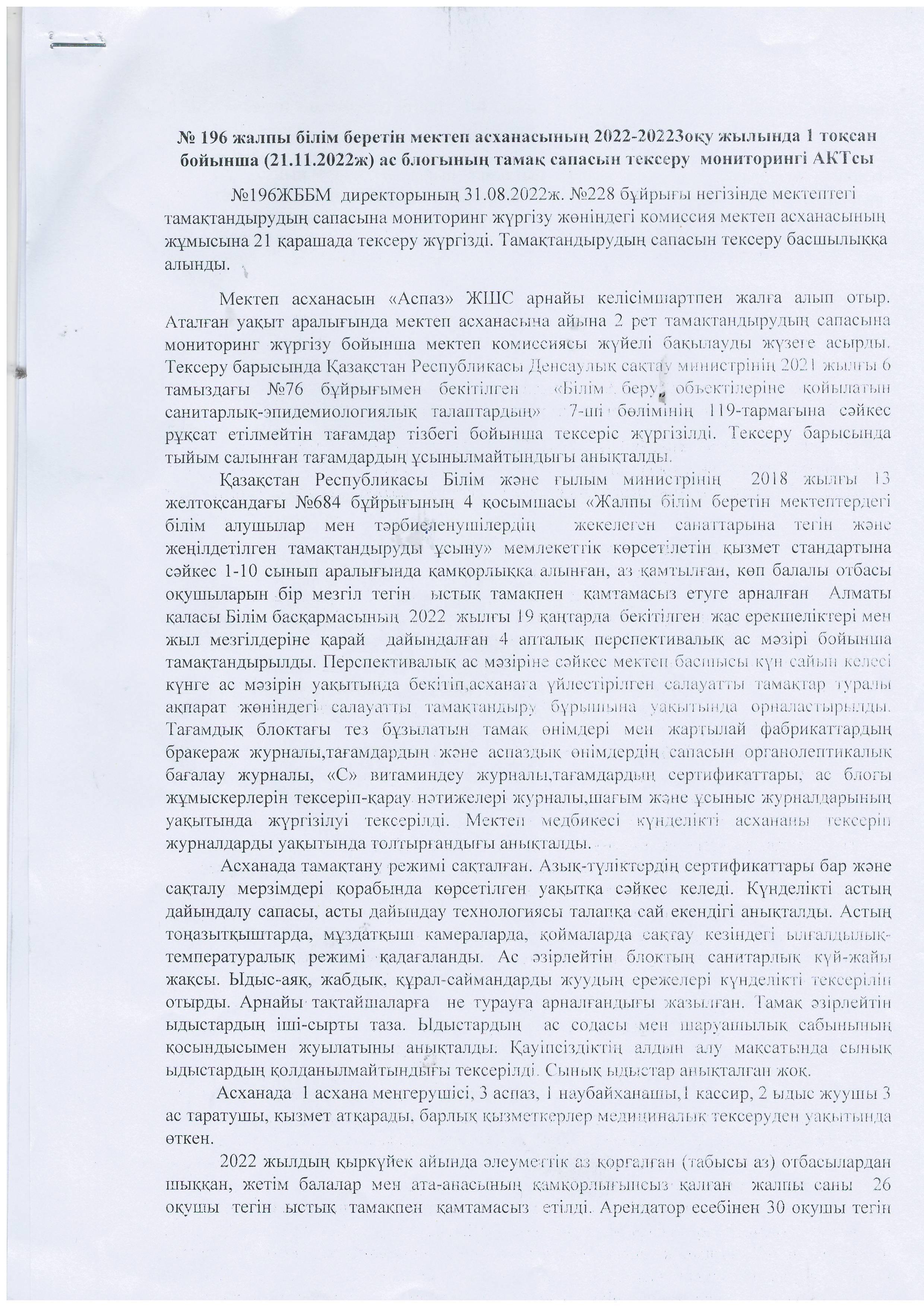 № 196 жалпы білім беретін мектеп асханасының 2022-20223оқу жылында 1 тоқсан бойынша (21.11.2022ж) ас блогының тамақ сапасын тексеру мониторингі АКТсы