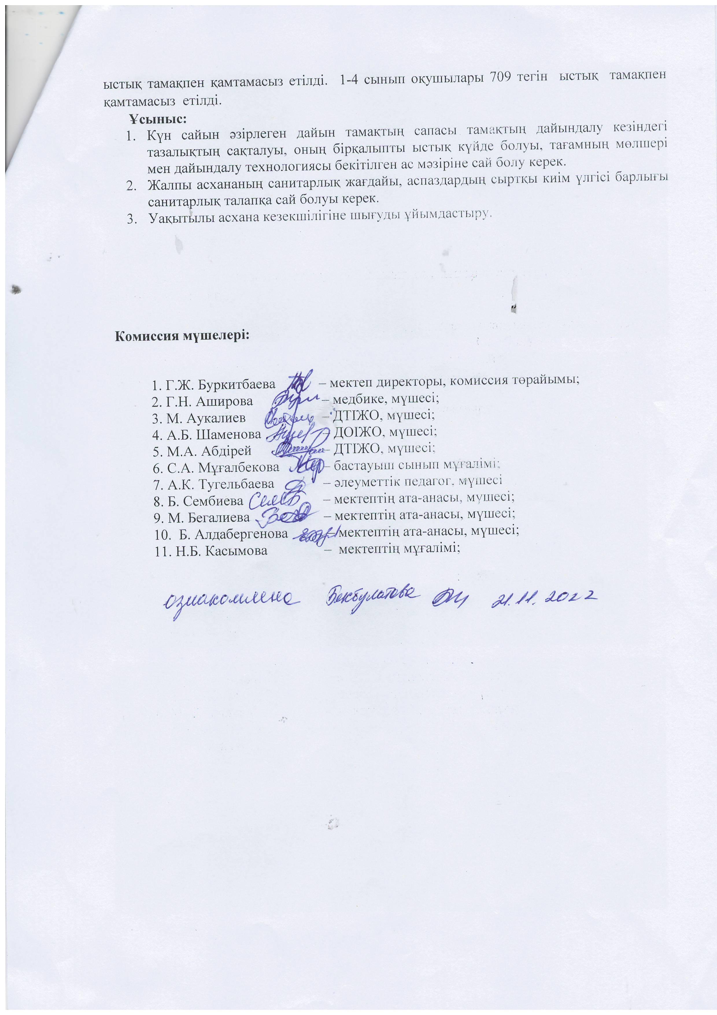 №196 мектеп » Тамақтандыру » № 196 жалпы білім беретін мектеп асханасының 2022-20223оқу жылында 1 тоқсан бойынша (21.11.2022ж) ас блогының тамақ сапасын тексеру мониторингі АКТсы