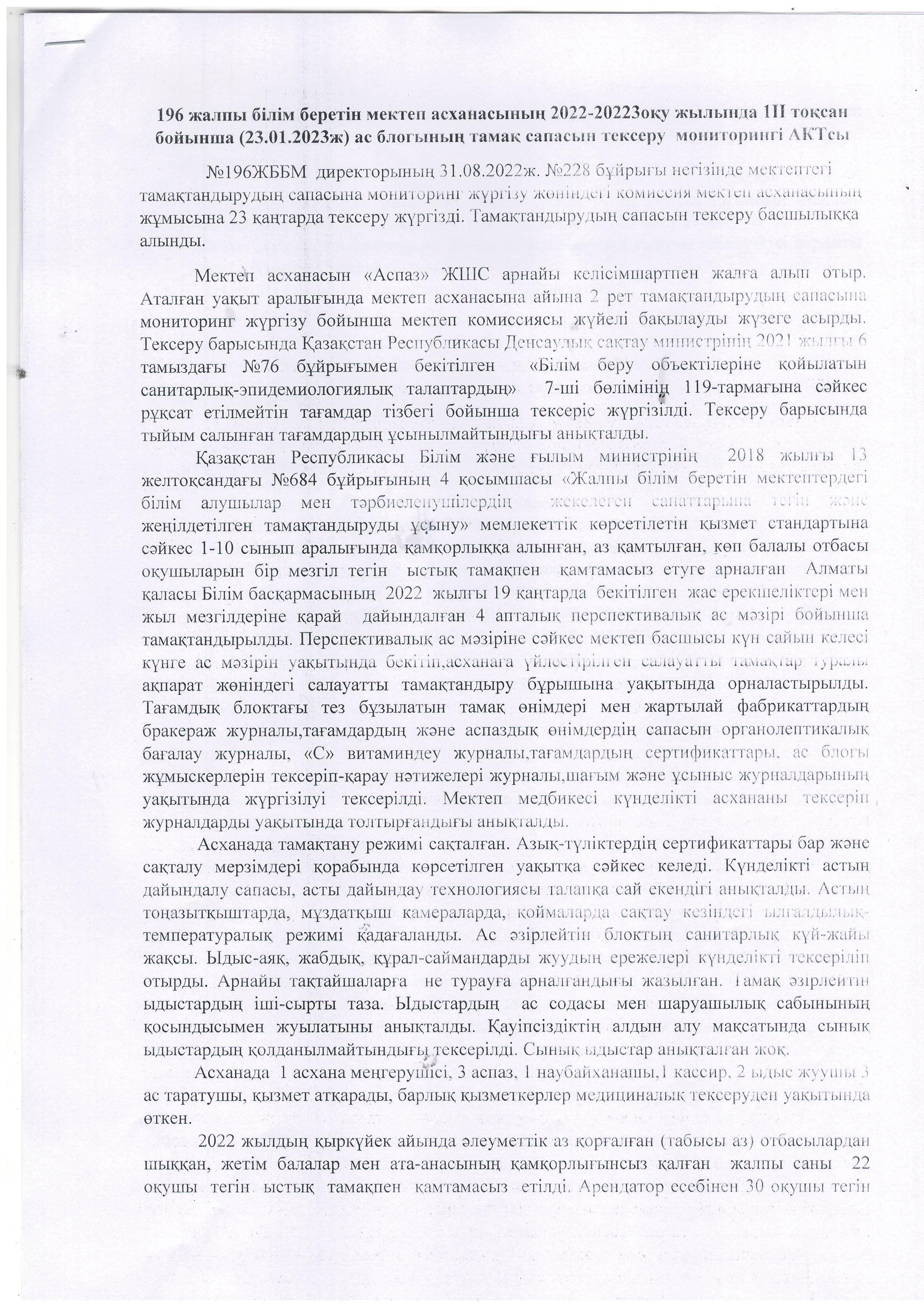 23.01.2023. 196 жалпы білім беретін мектеп асханасының 2022-20223оқу жылында ІІІ тоқсан бойынша (23.01.2023ж) ас блогының тамақ сапасын тексеру мониторингі АКТсы