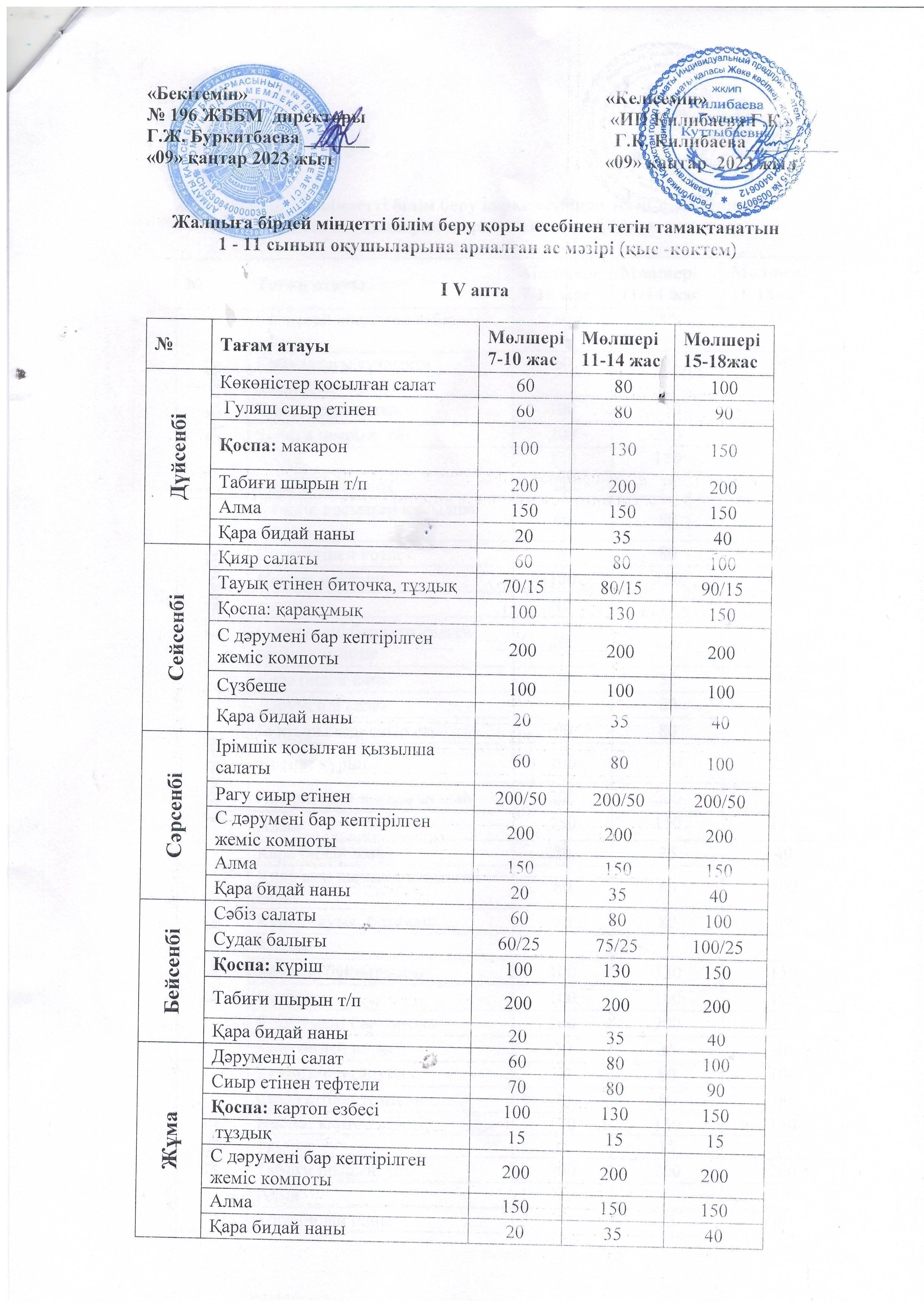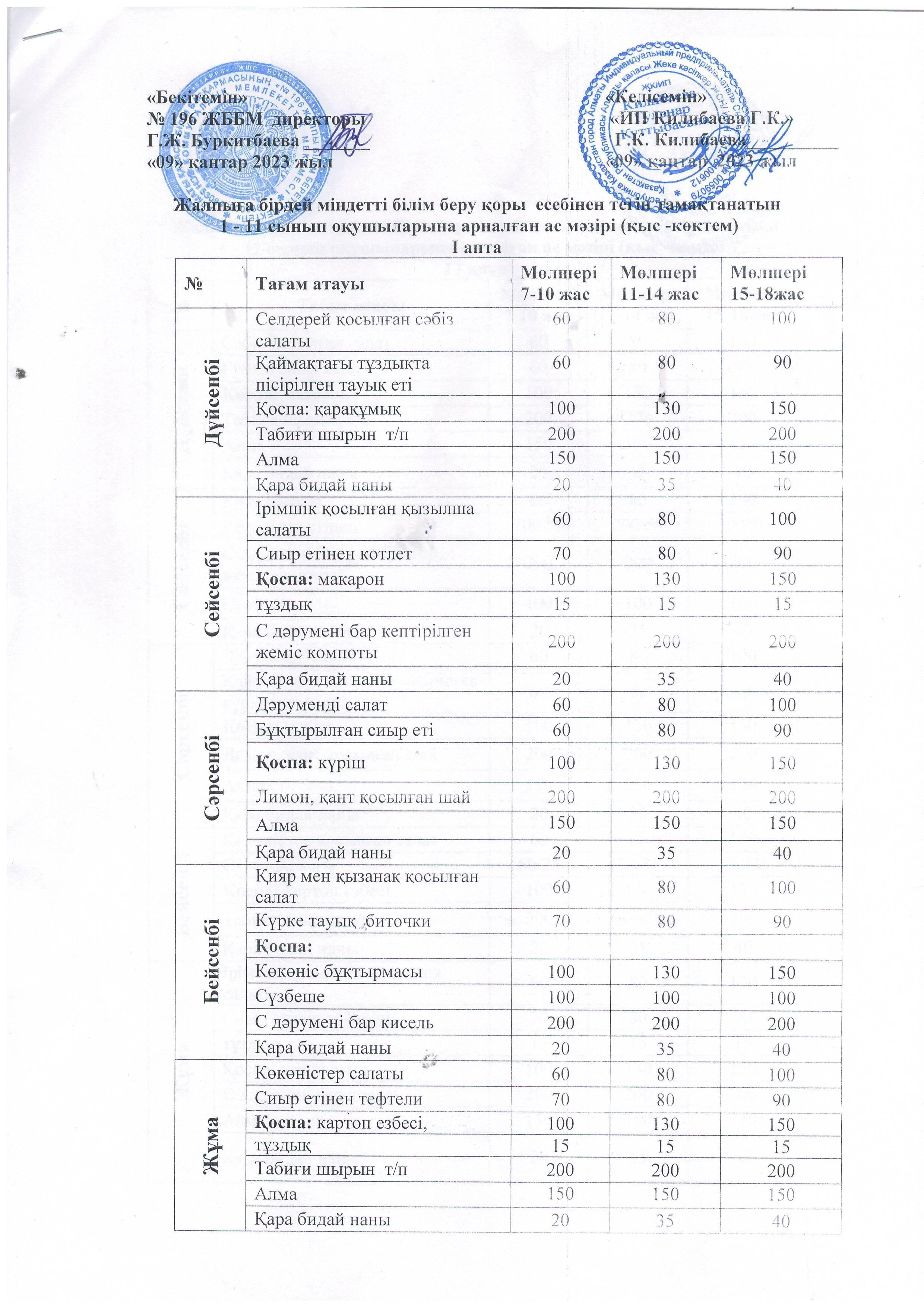 №196 мектеп » Тамақтандыру » 09.01.2023.Жалпыға бірдей міндетті білім беру қоры есебінен тегін тамақтанатын 1 - 10 сынып оқушыларына арналған ас мәзірі (қыс -көктем) І апта