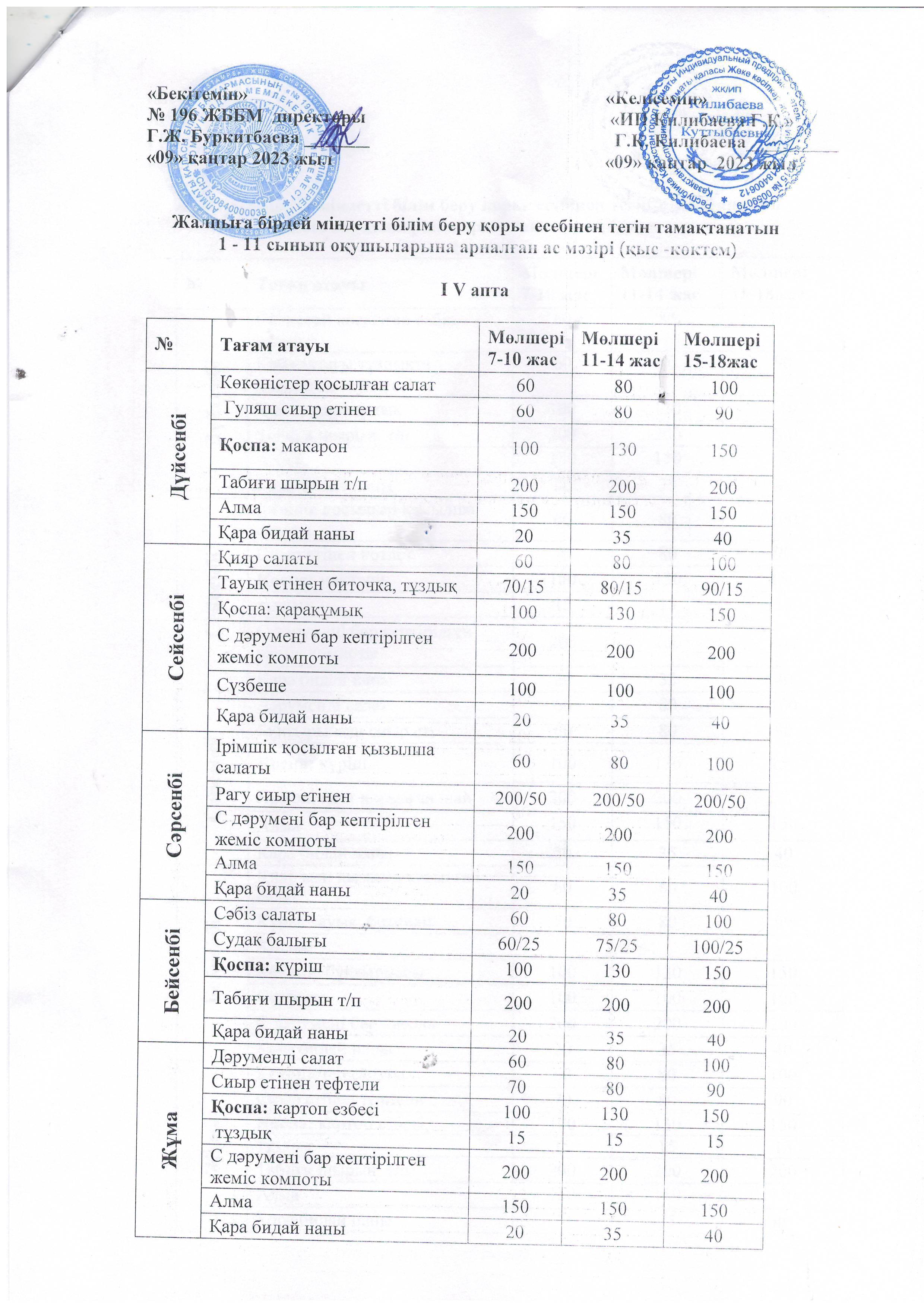 27 март 2023 0 1 2 3 4 5 27.03.2023. Жалпыға бірдей міндетті білім беру қоры есебінен тегін тамақтанатын 1 - 10 сынып оқушыларына арналған ас мәзірі (қыс -көктем) І V апта