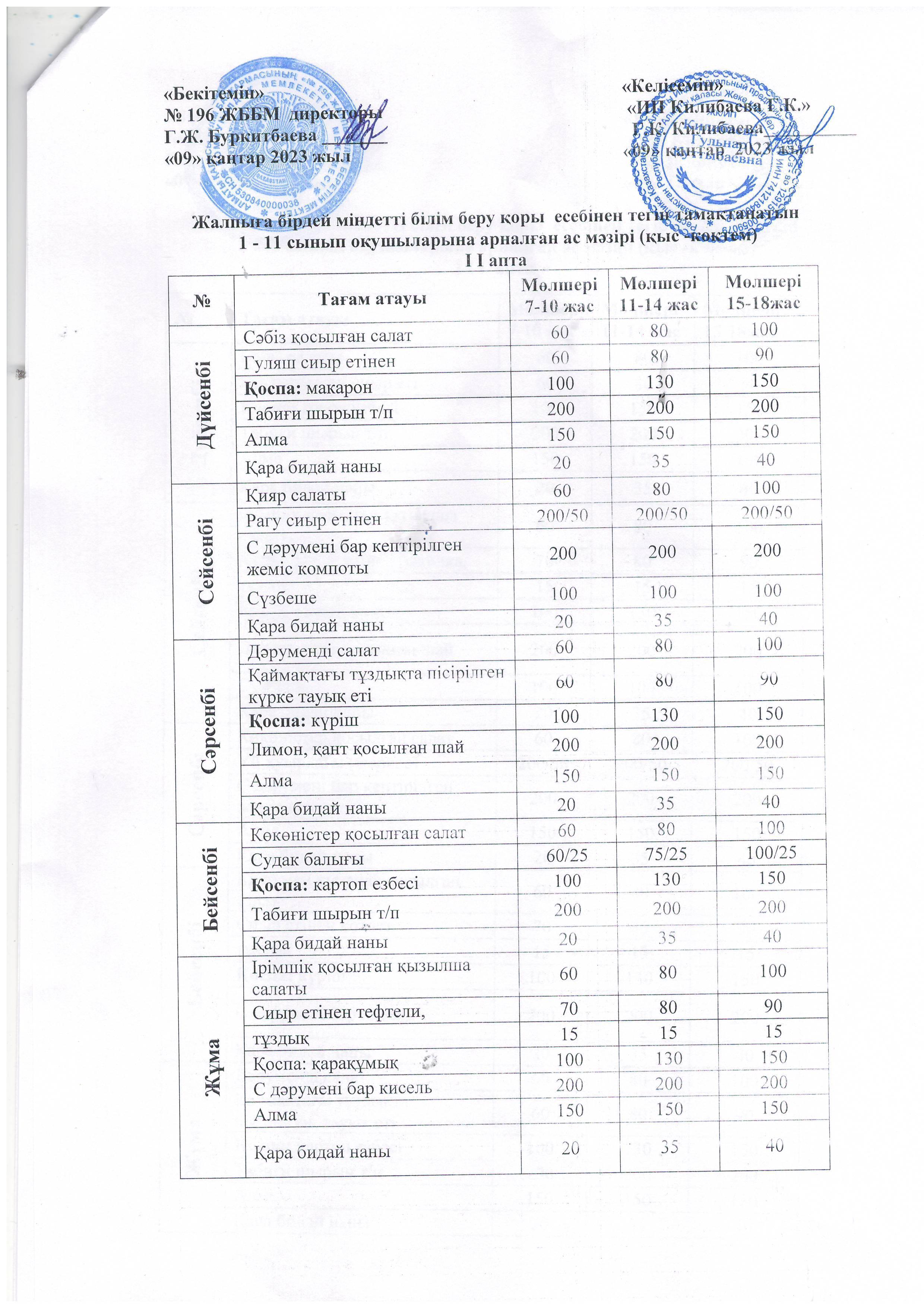 11 май 2023 0 1 2 3 4 5 11.05.2023. Жалпыға бірдей міндетті білім беру қоры есебінен тегін тамақтанатын 1 - 10 сынып оқушыларына арналған ас мәзірі (қыс -көктем) І I апта
