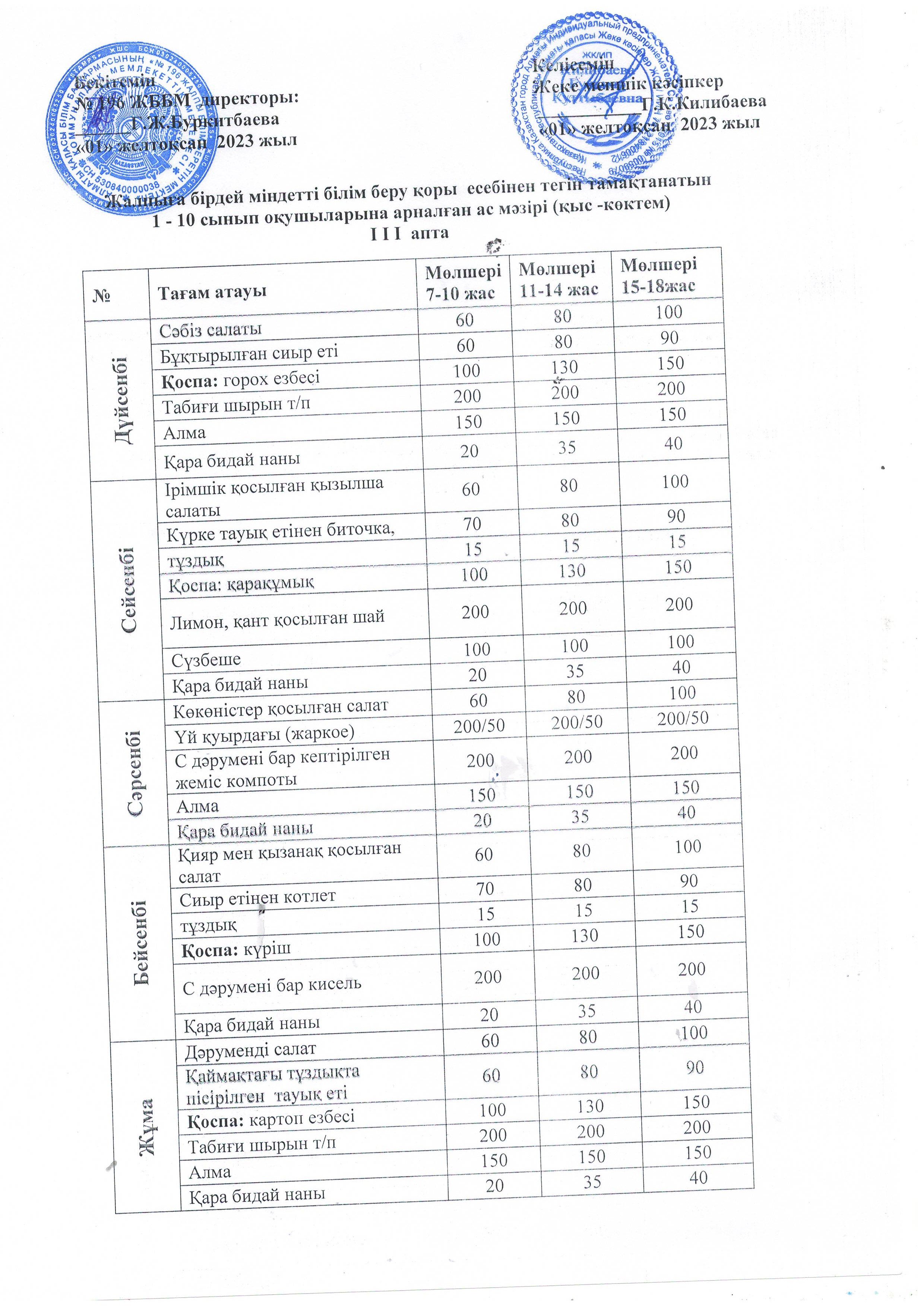 22 январь 2024 0 1 2 3 4 5 Сәбіз салаты. бұқтырылған сиыр еті. Қоспа: горох езбесі. Табиғи шырын т/п.Алма. Қара бидай наны,