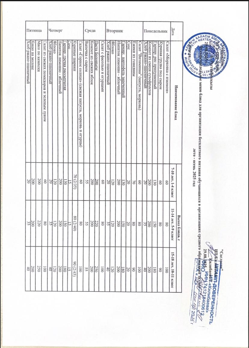 » Тегін тамақтандыруды ұйымдастыруға арналған тағамдар мәзірі (жаз-күз)