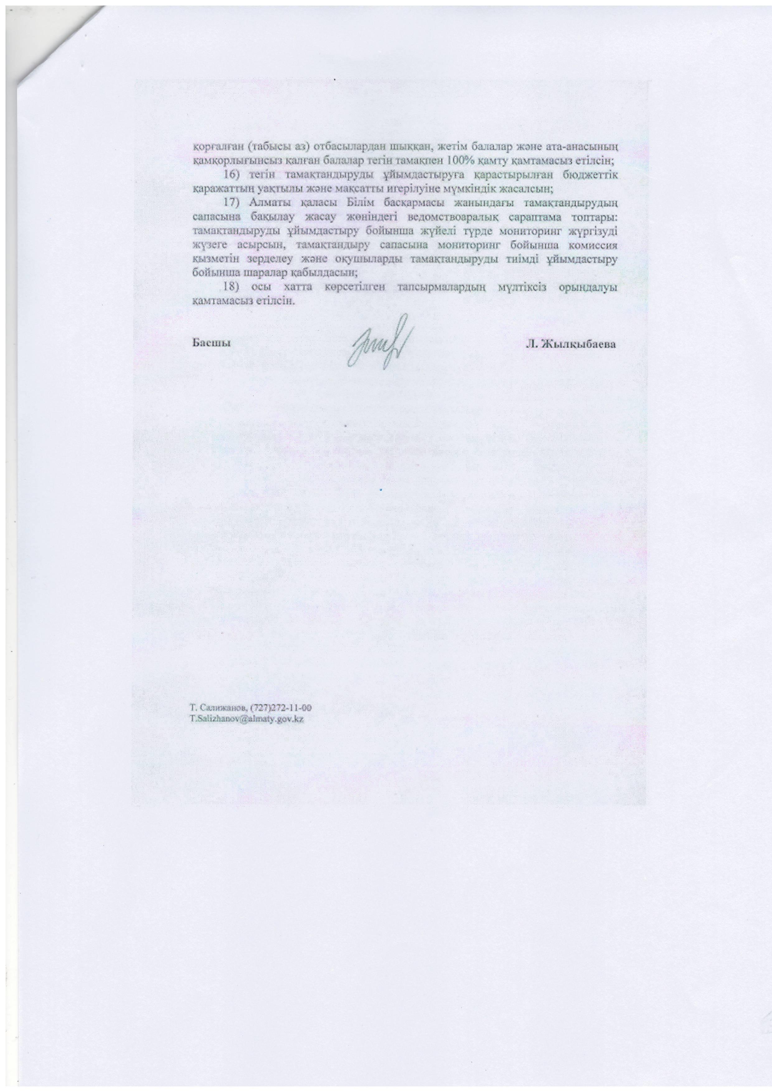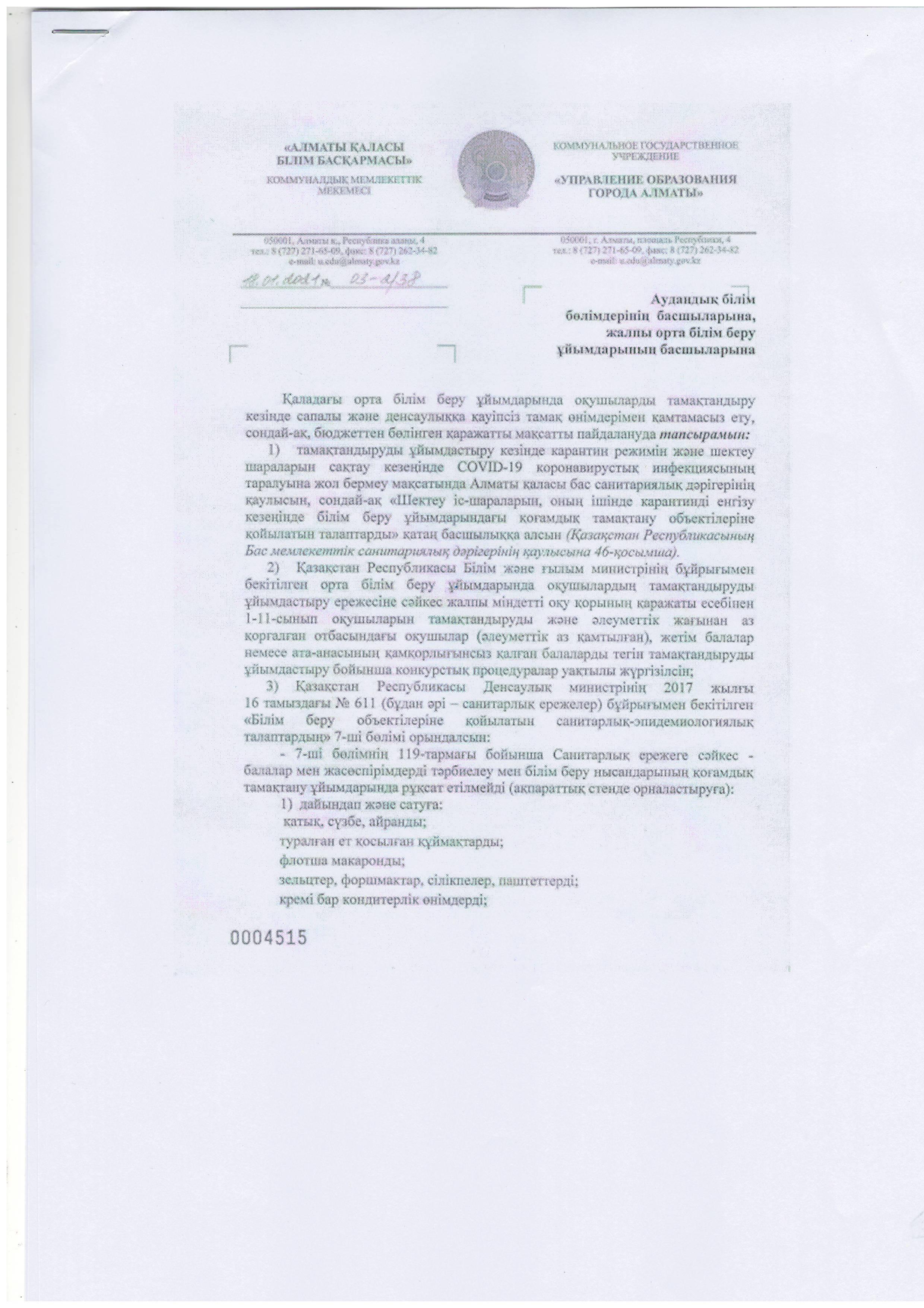 №196 мектеп » Тамақтандыру » Тамақтандыру туралы ақпарат 18.01.2021ж. 03-2/38 Аудандық білім бөлімдерінің басшыларына, жалпы орта білім беру ұйымдарының басшыларына (Л.Жылқыбаева)