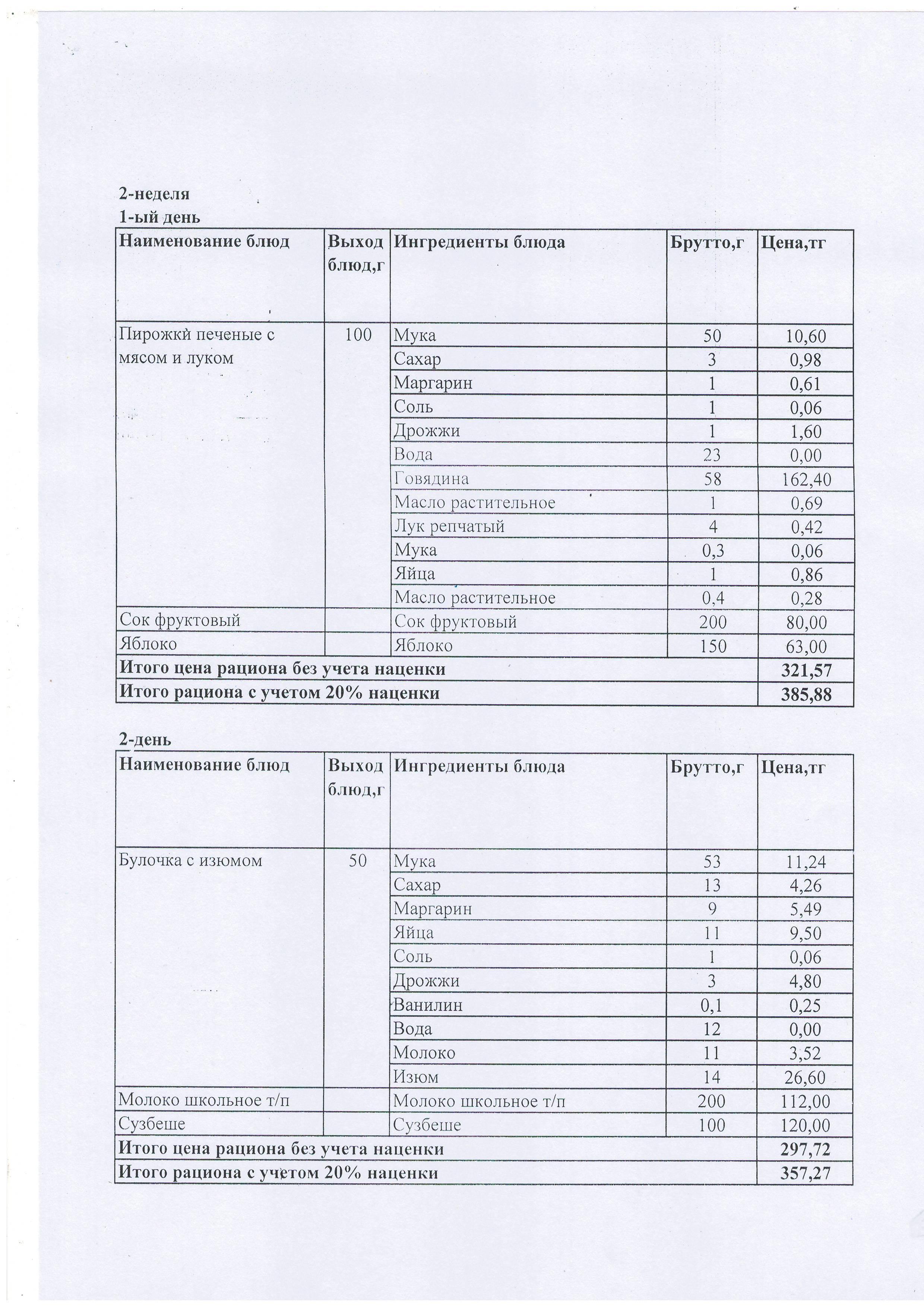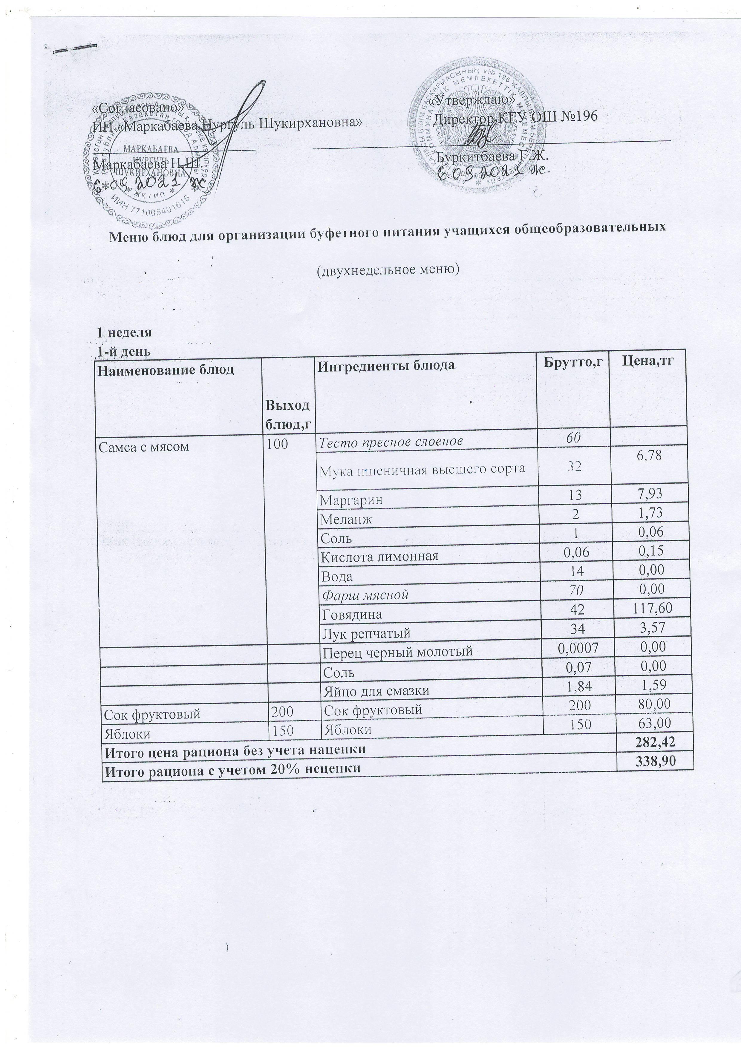 Питание. Меню блюд для организации буфетного питания учащихся КГУ ОШ №196 (двухнедельное меню: 1 неделя; 2 неделя)