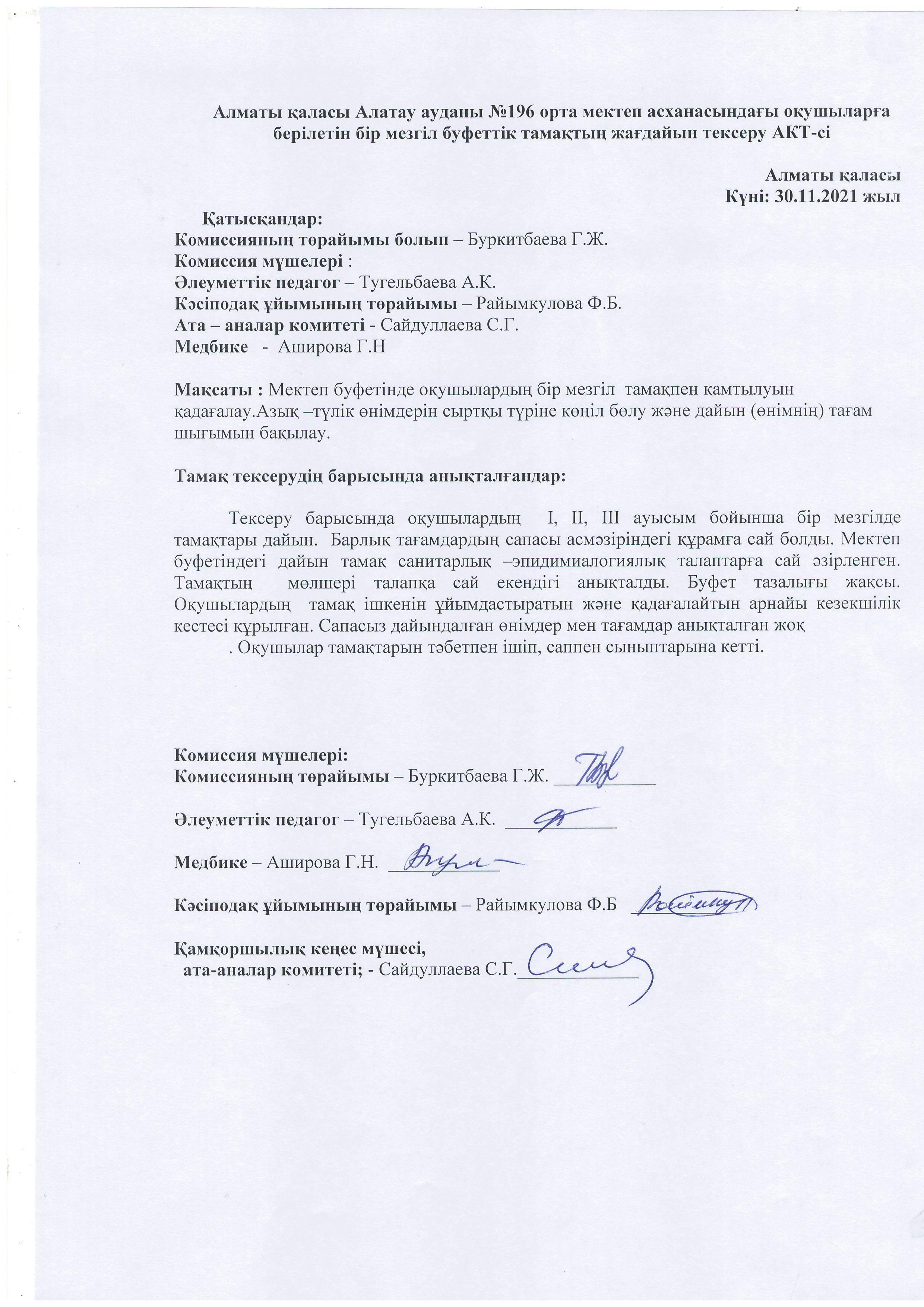 Алматы қаласы Алатау ауданы №196 ЖББМ асханасындағы оқушыларға берілетін бір мезгіл тамақтың жағдайын тексеру АКТ-сі 30.11.2021ж.