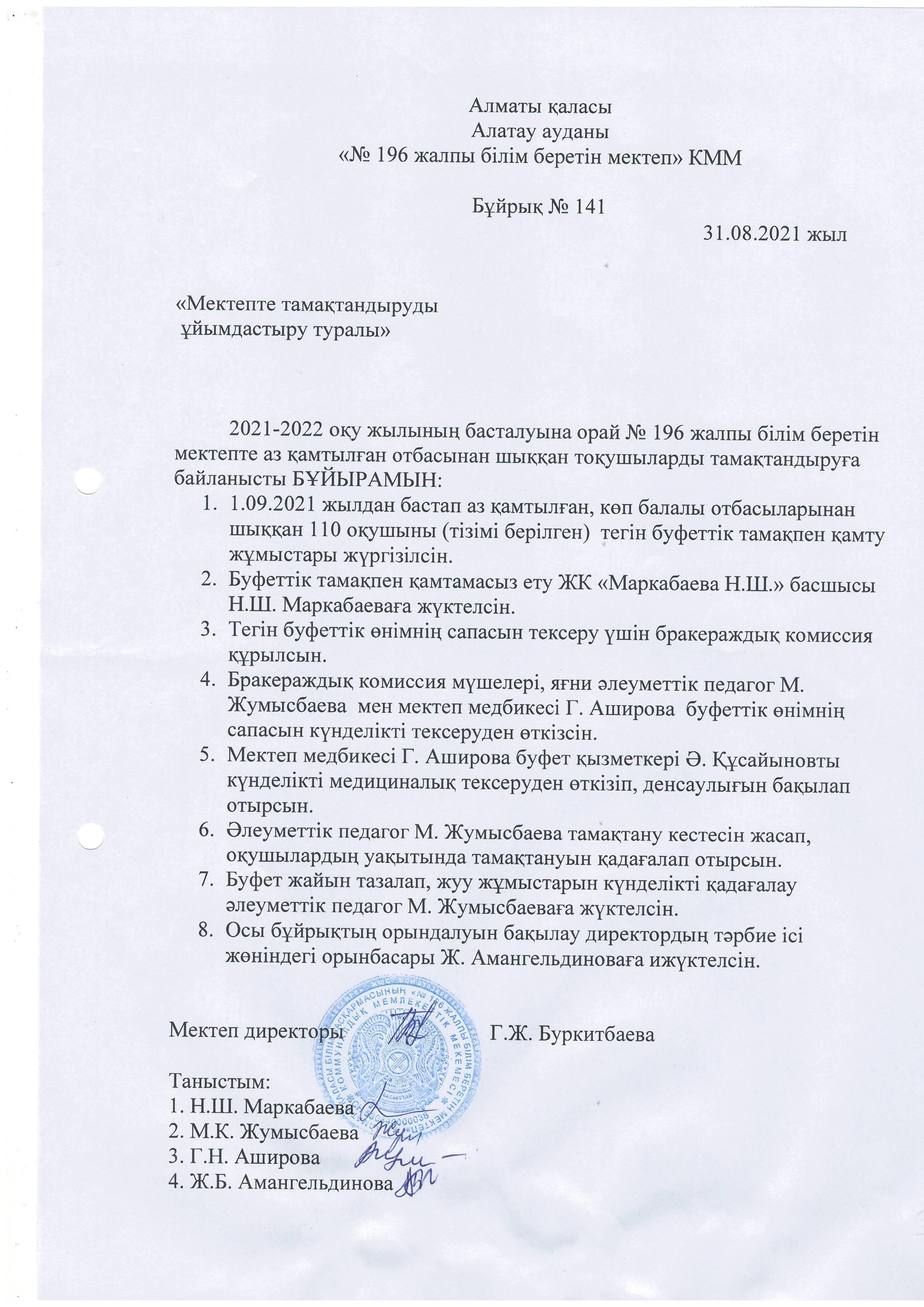 18 январь 2022 0 1 2 3 4 5 Бұйрық №141 "Мектепте тамақтандыруды ұйымдастыру туралы" 31.08.2021ж. Теги: Тамақтандыру туралы ақпарат