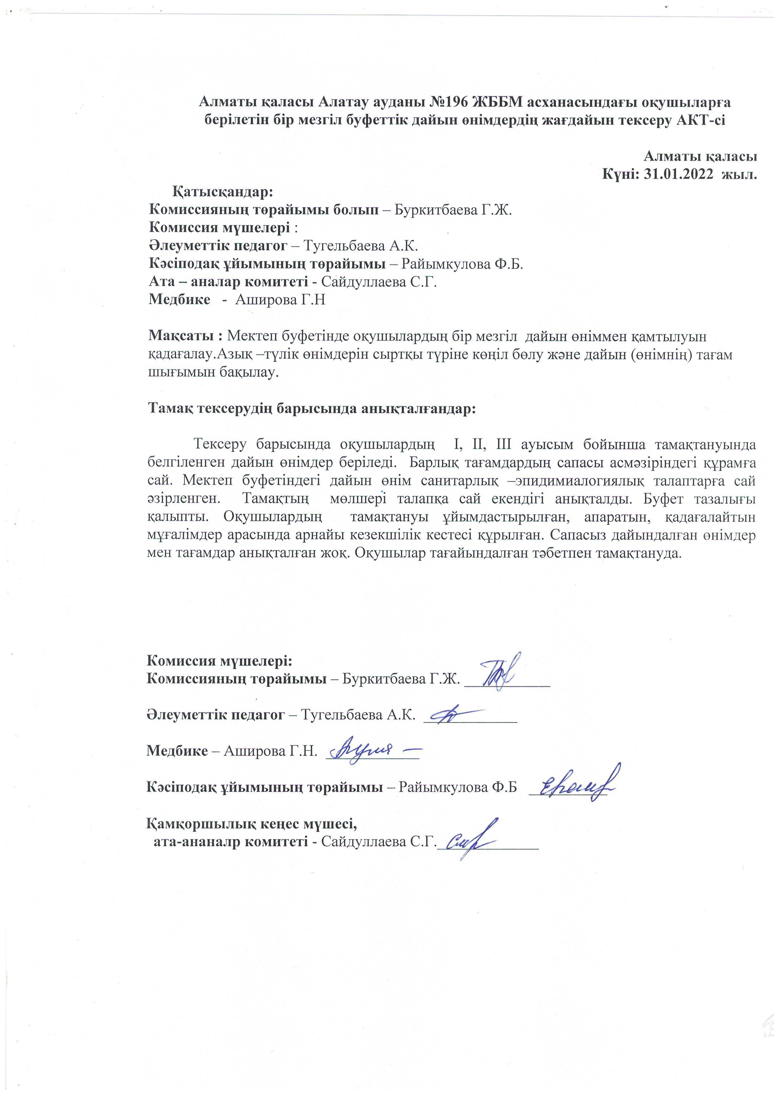 Алматы қаласы Алатау ауданы №196 ЖББМ асханасындағы оқушыларға берілетін бір мезгіл буфеттік тамақтың жағдайын тексеру АКТ-сі 31.01.2022 жыл.