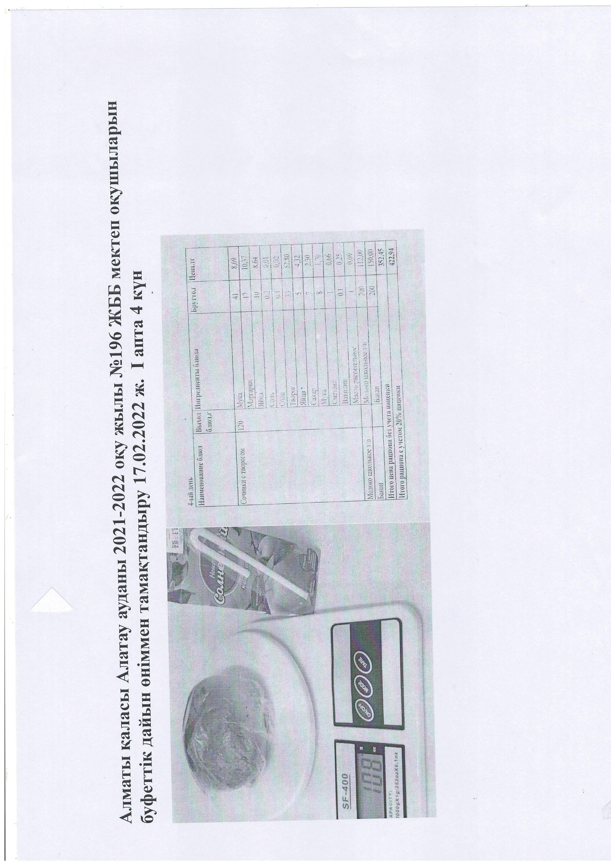 Алматы қаласы Алатау ауданы 2021-2022 оқу жылы №196 ЖББ мектеп оқушыларын буфеттік дайын өніммен тамақтандыру 17.02.2022 ж. І апта 4 күн