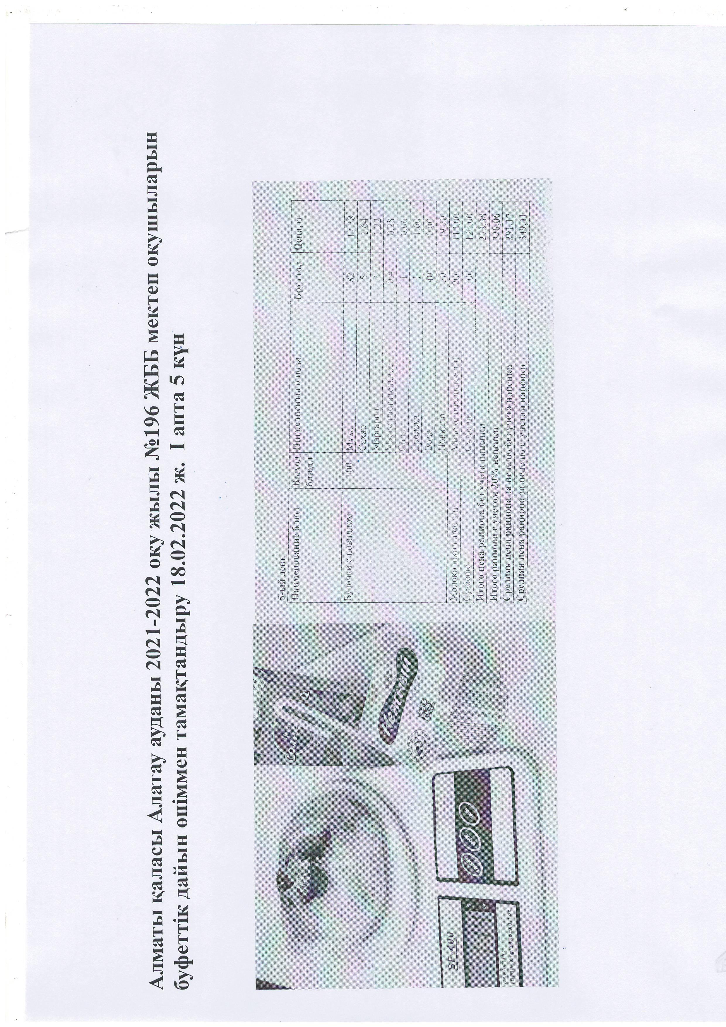 Алматы қаласы Алатау ауданы 2021-2022 оқу жылы №196 ЖББ мектеп оқушыларын буфеттік дайын өніммен тамақтандыру 18.02.2022 ж. І апта 5 күн
