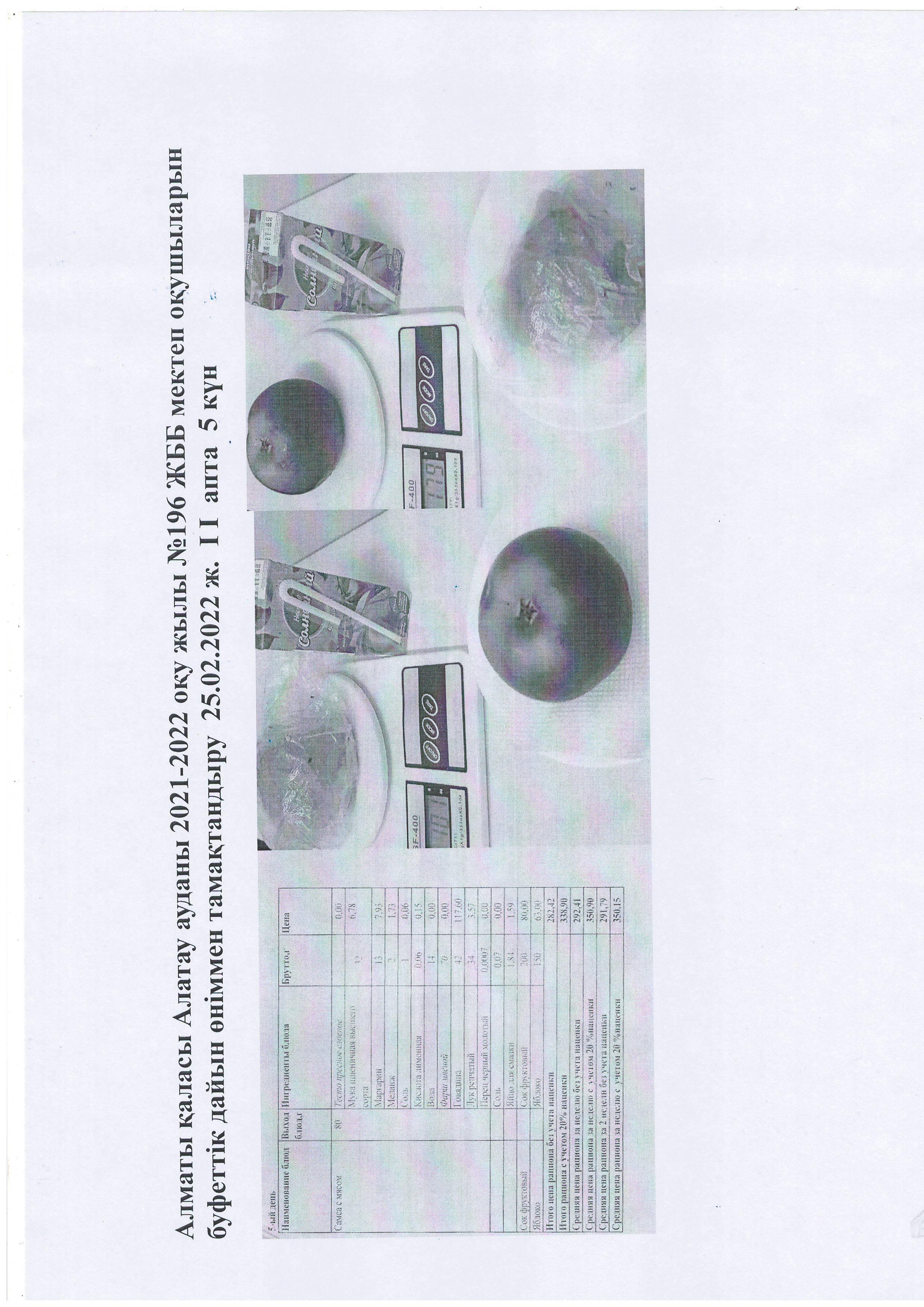 Алматы қаласы Алатау ауданы 2021-2022 оқу жылы №196 ЖББ мектеп оқушыларын буфеттік дайын өніммен тамақтандыру 25.02.2022 ж. І І апта 5 күн