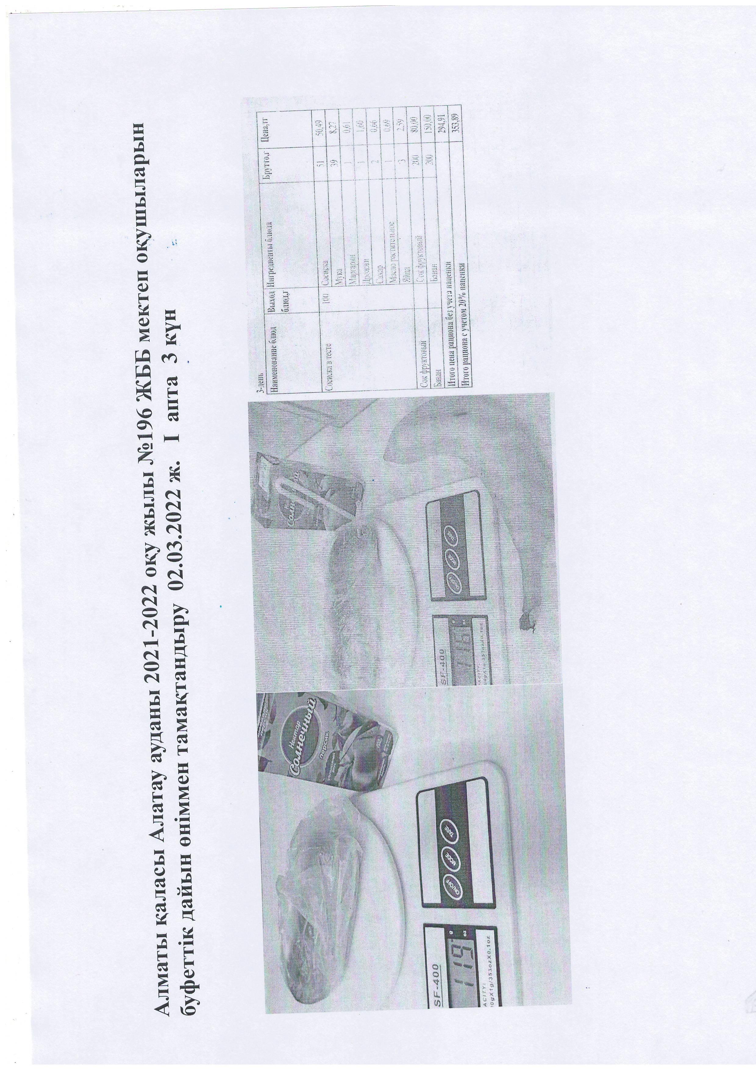 Алматы қаласы Алатау ауданы 2021-2022 оқу жылы №196 ЖББ мектеп оқушыларын буфеттік дайын өніммен тамақтандыру 02.03.2022 ж. І апта 3 күн