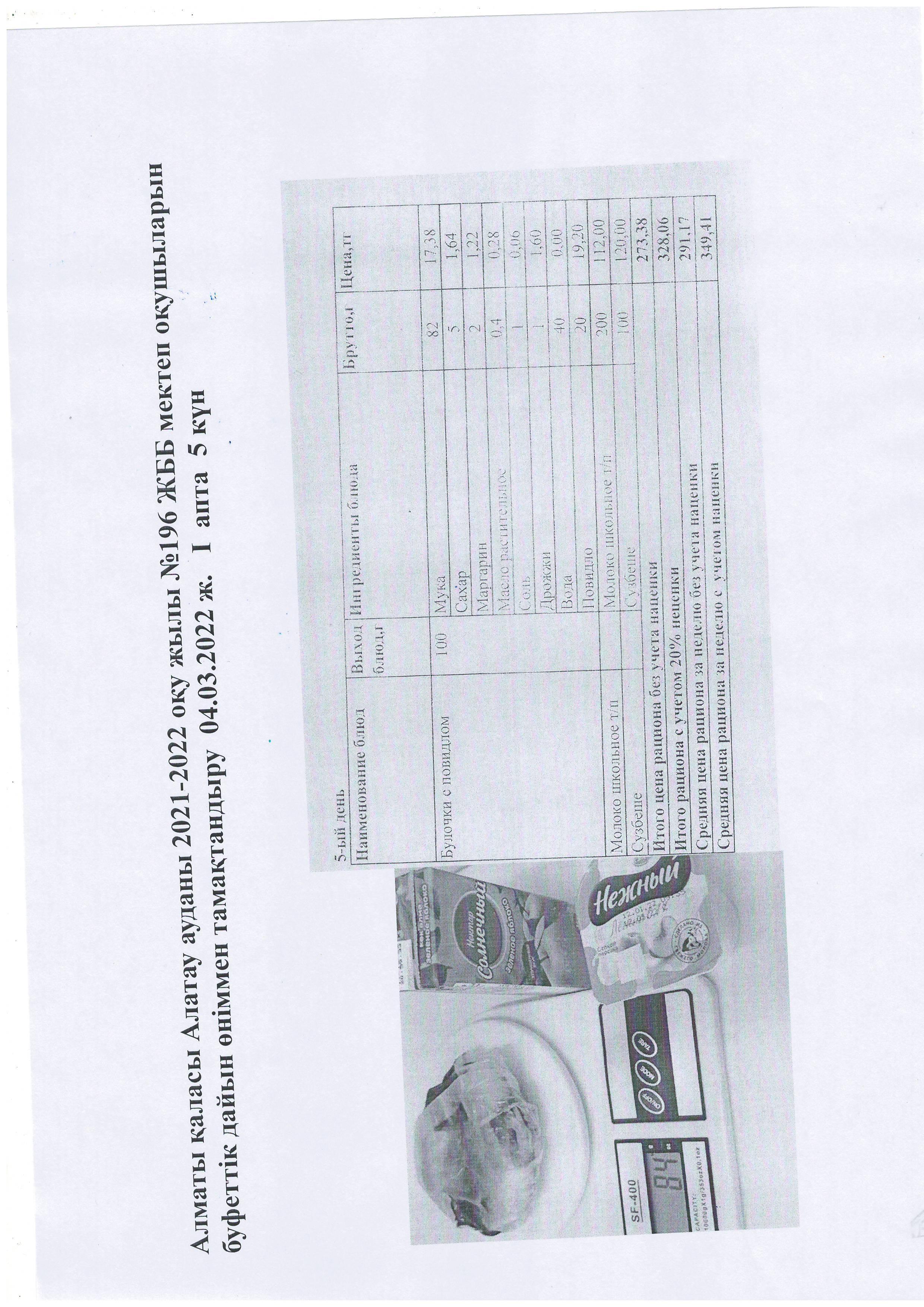 Алматы қаласы Алатау ауданы 2021-2022 оқу жылы №196 ЖББ мектеп оқушыларын буфеттік дайын өніммен тамақтандыру 04.03.2022 ж. І апта 5 күн