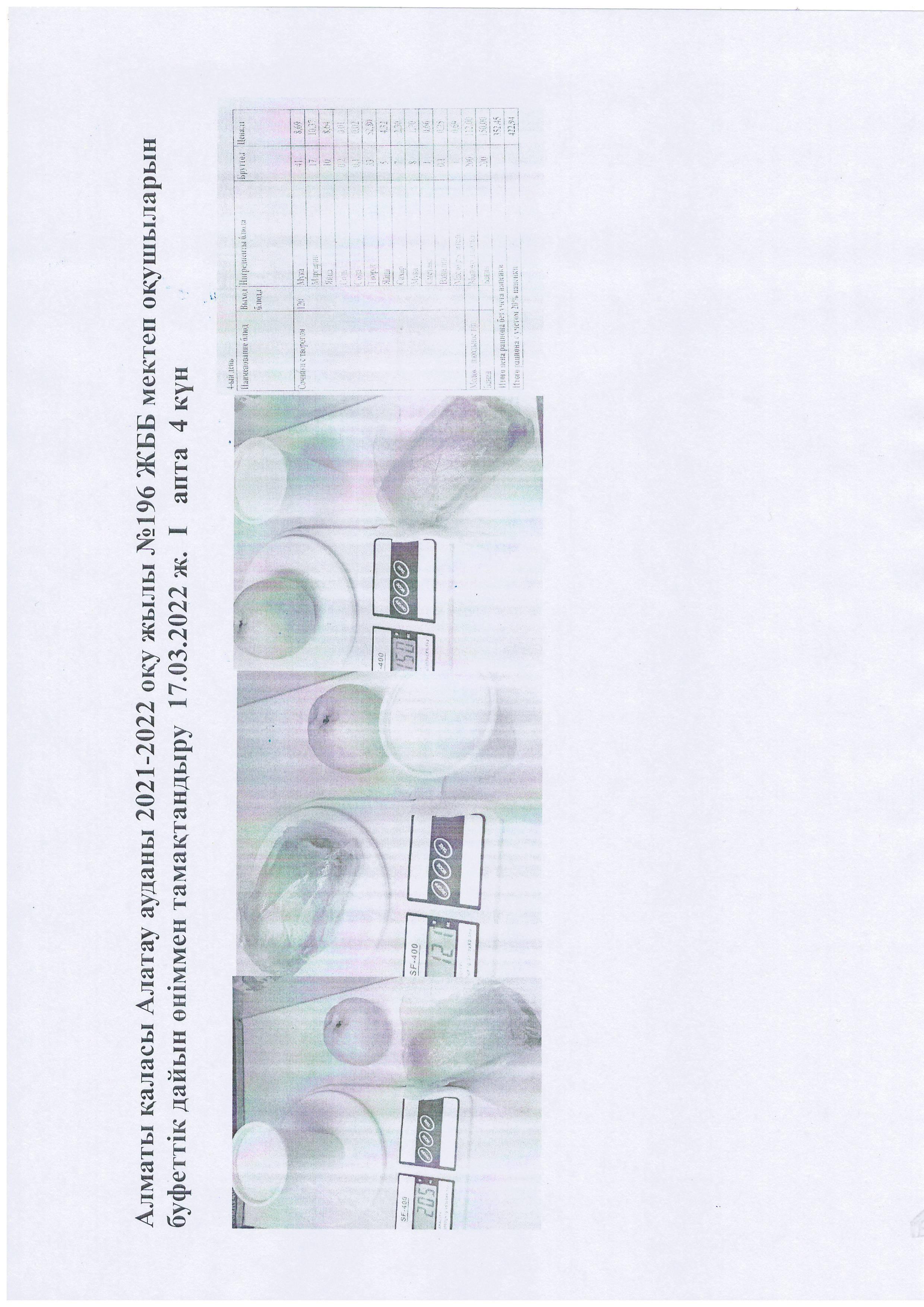 Алматы қаласы Алатау ауданы 2021-2022 оқу жылы №196 ЖББ мектеп оқушыларын буфеттік дайын өніммен тамақтандыру 17.03.2022 ж. І апта 4 күн