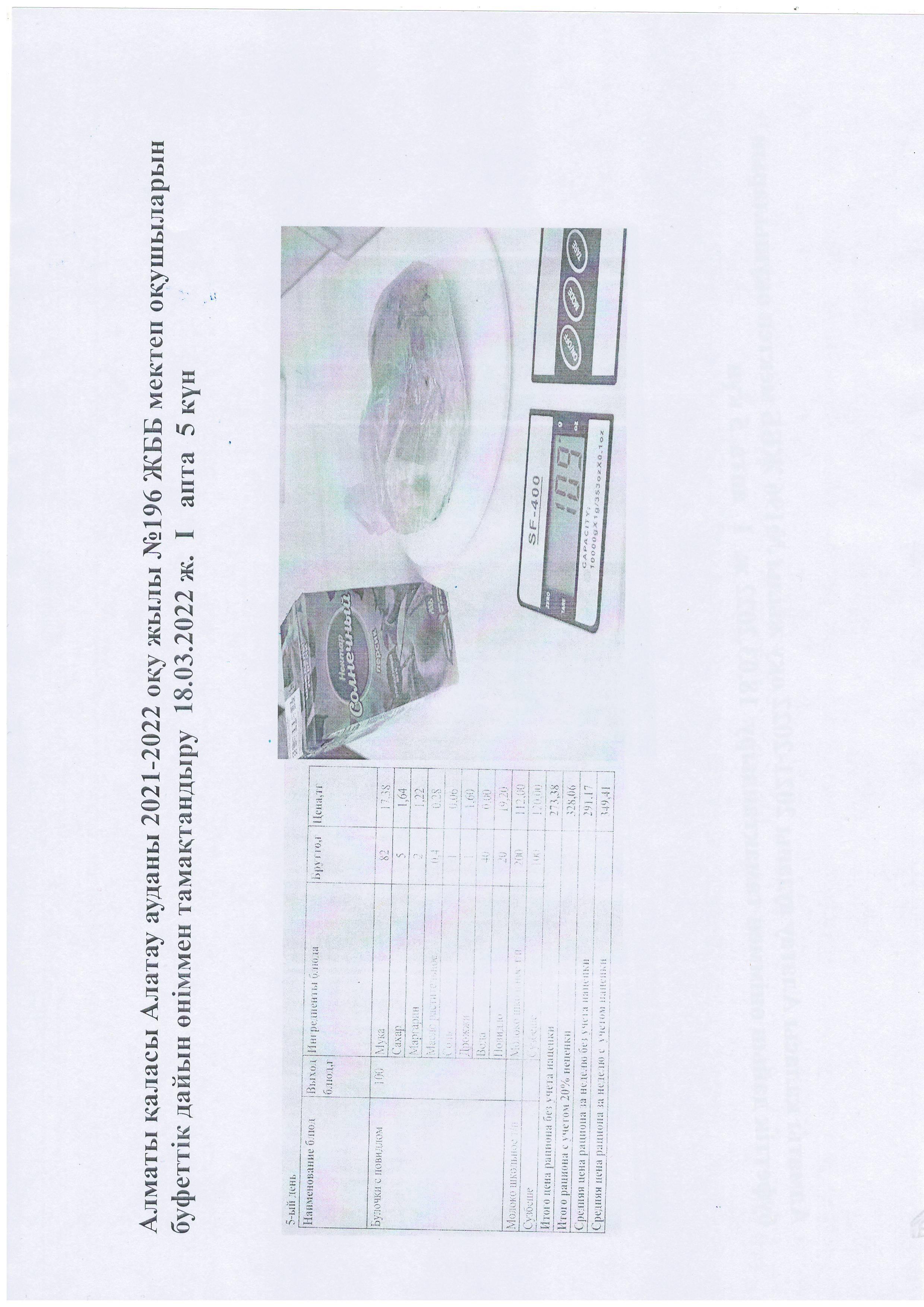Алматы қаласы Алатау ауданы 2021-2022 оқу жылы №196 ЖББ мектеп оқушыларын буфеттік дайын өніммен тамақтандыру 18.03.2022 ж. І апта 5 күн