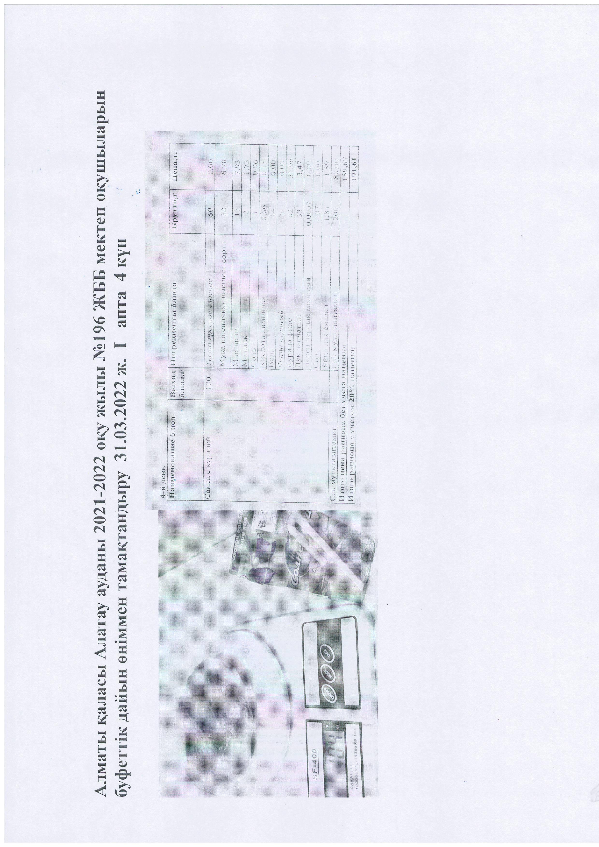 Алматы қаласы Алатау ауданы 2021-2022 оқу жылы №196 ЖББ мектеп оқушыларын буфеттік дайын өніммен тамақтандыру 31.03.2022 ж. І апта 4 күн