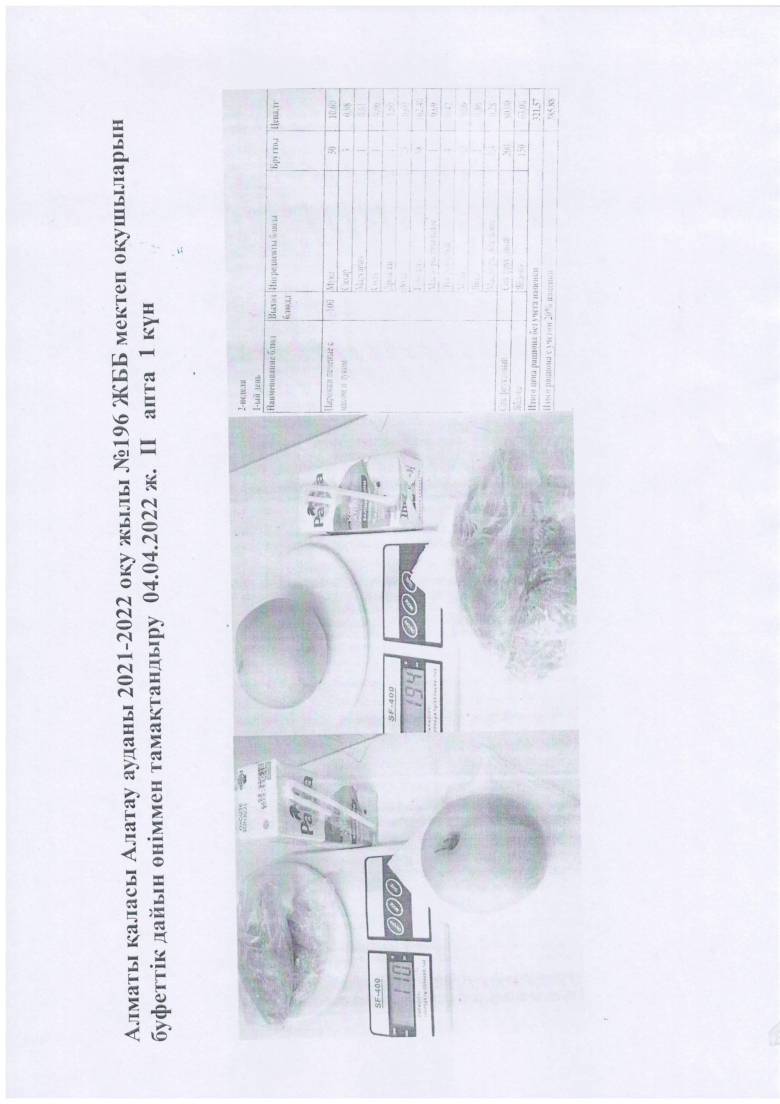 Алматы қаласы Алатау ауданы 2021-2022 оқу жылы №196 ЖББ мектеп оқушыларын буфеттік дайын өніммен тамақтандыру 04.04.2022 ж. ІІ апта 1 күн