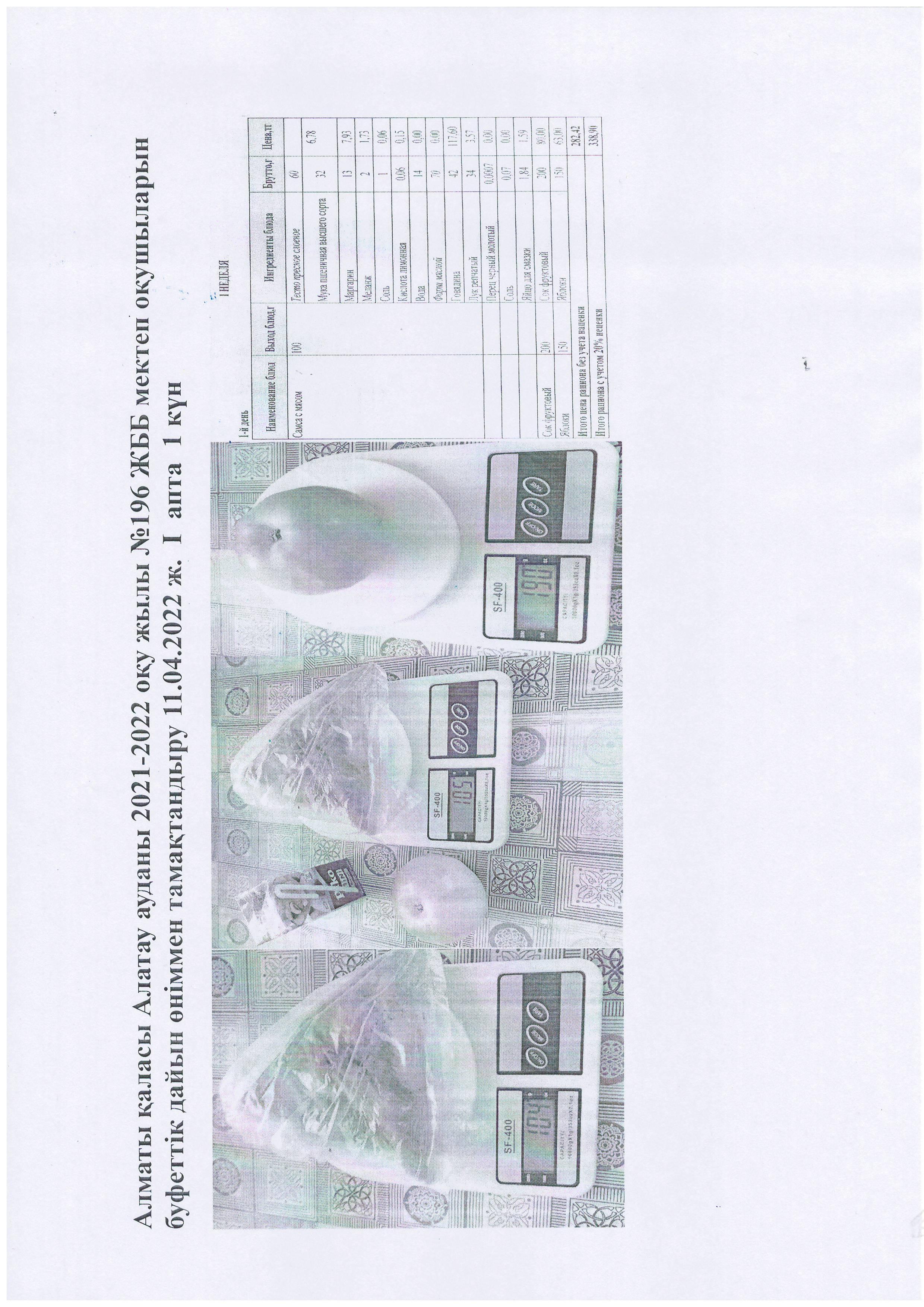 Алматы қаласы Алатау ауданы 2021-2022 оқу жылы №196 ЖББ мектеп оқушыларын буфеттік дайын өніммен тамақтандыру 11.04.2022 ж. І апта 1 күн