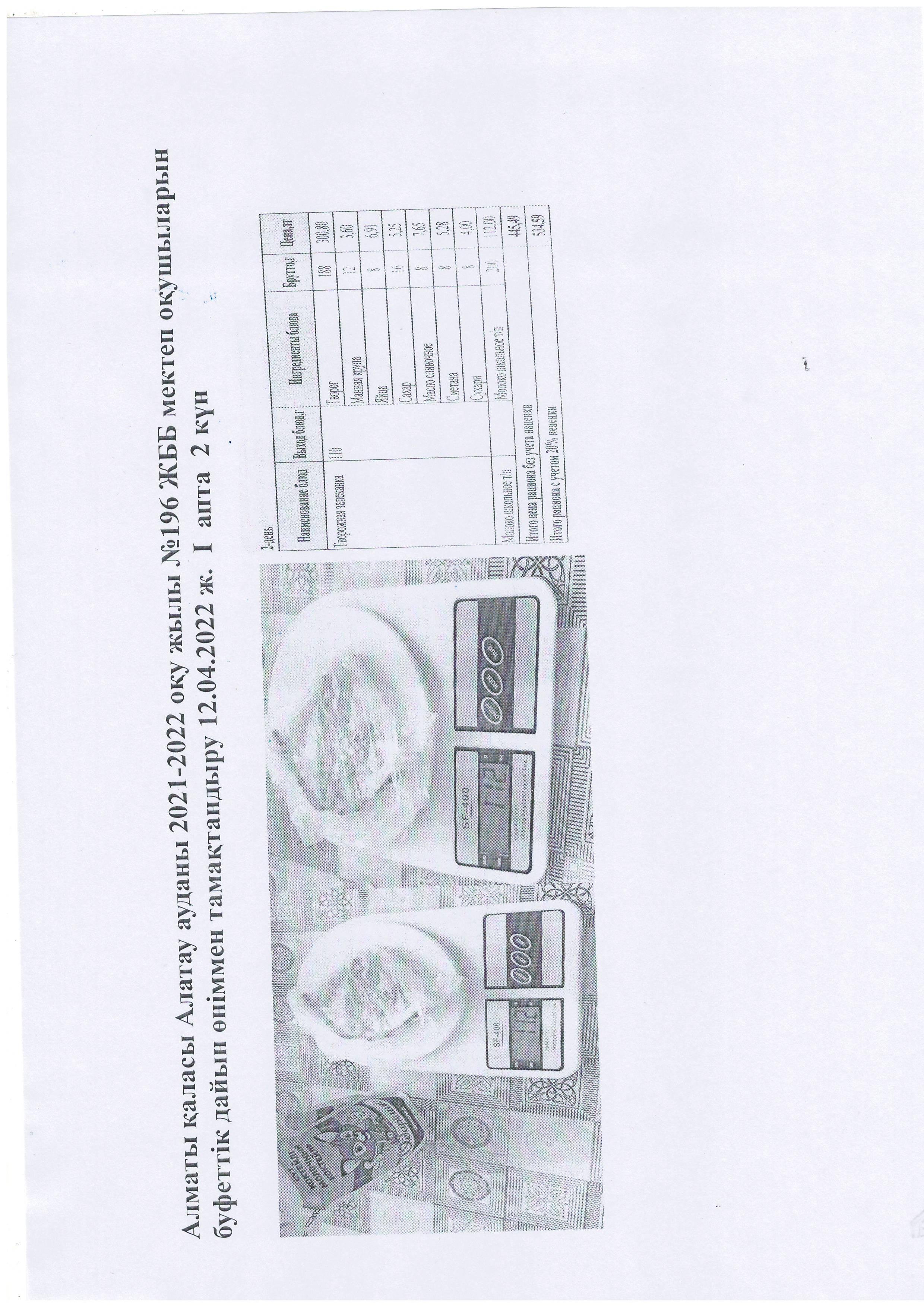 Алматы қаласы Алатау ауданы 2021-2022 оқу жылы №196 ЖББ мектеп оқушыларын буфеттік дайын өніммен тамақтандыру 12.04.2022 ж. І апта 2 күн
