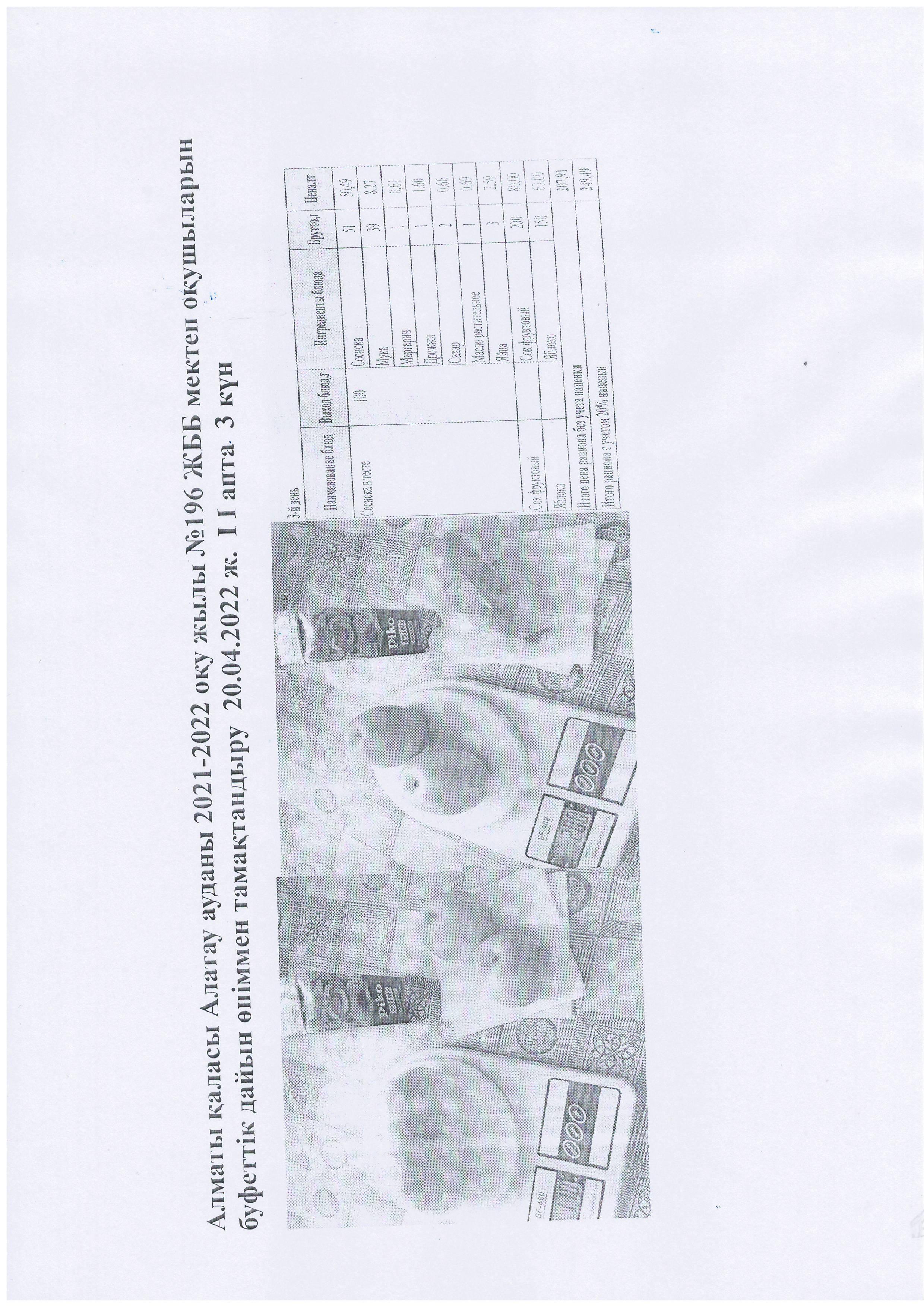 №196 мектеп » Тамақтандыру » Алматы қаласы Алатау ауданы 2021-2022 оқу жылы №196 ЖББ мектеп оқушыларын буфеттік дайын өніммен тамақтандыру 20.04.2022 ж. І І апта 3 күн
