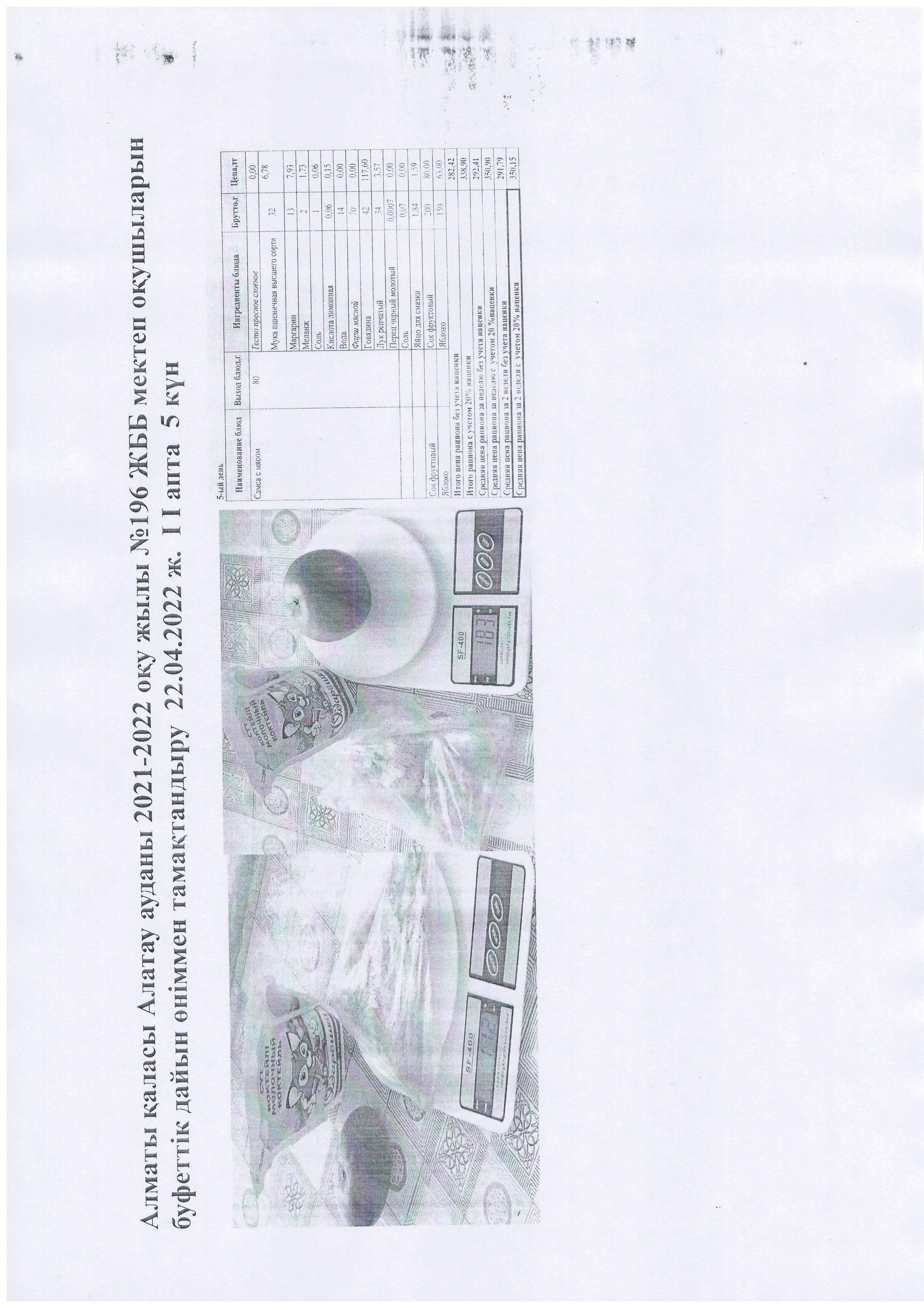 Алматы қаласы Алатау ауданы 2021-2022 оқу жылы №196 ЖББ мектеп оқушыларын буфеттік дайын өніммен тамақтандыру 22.04.2022 ж. І І апта 5 күн