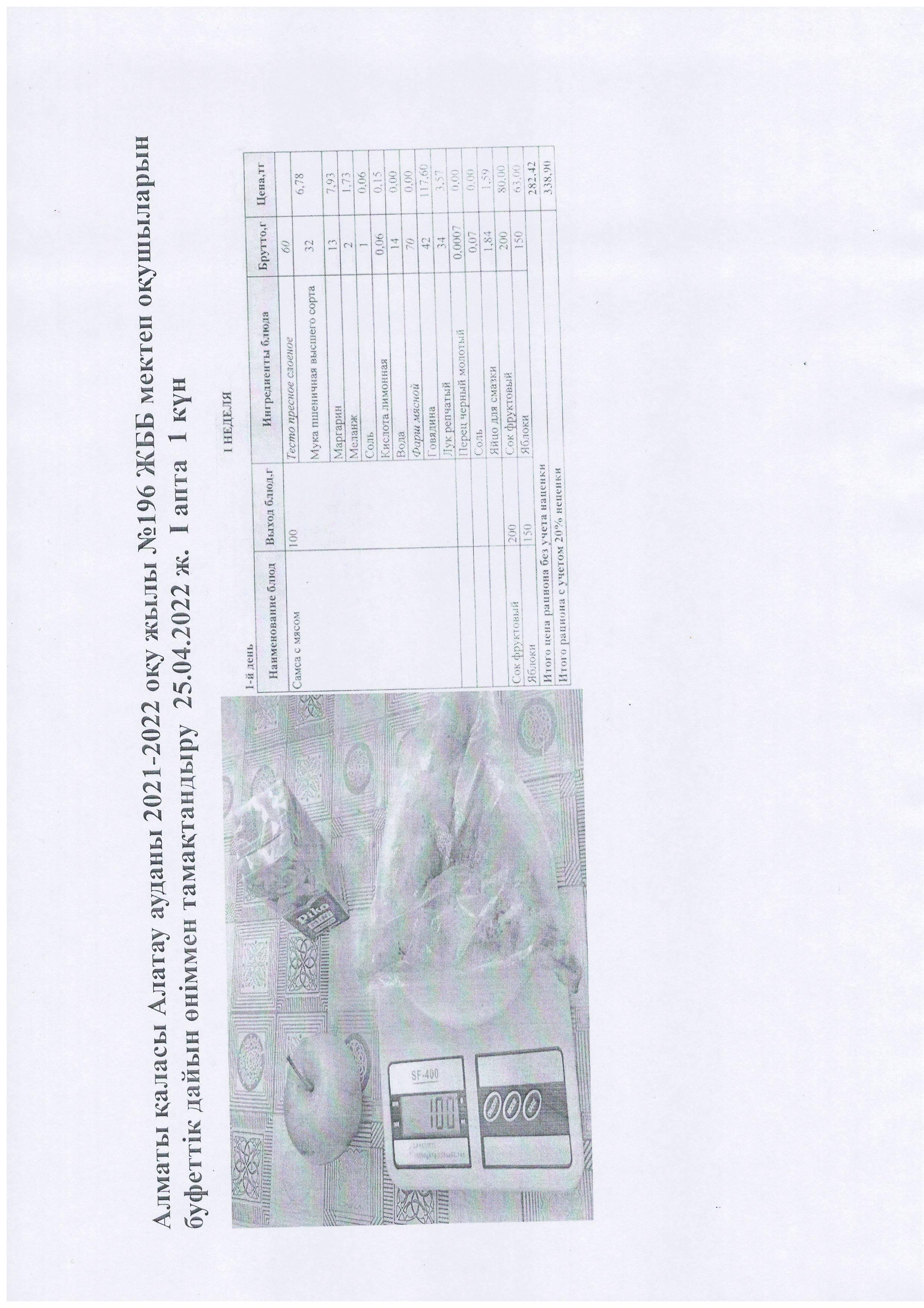 Алматы қаласы Алатау ауданы 2021-2022 оқу жылы №196 ЖББ мектеп оқушыларын буфеттік дайын өніммен тамақтандыру 25.04.2022 ж. І апта 1 күн