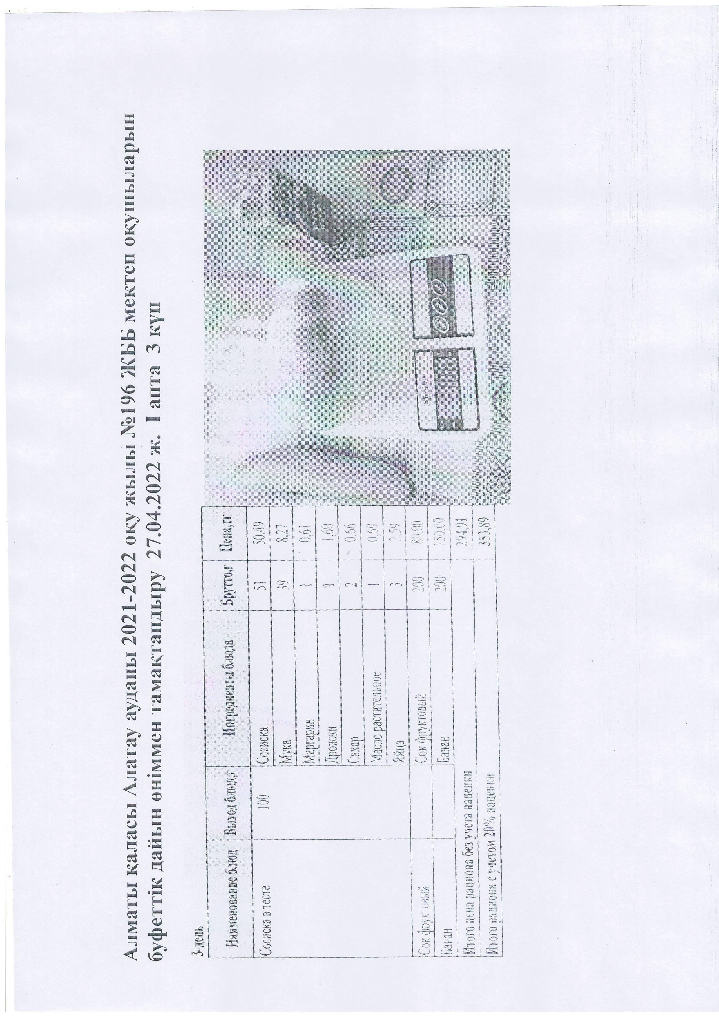 №196 мектеп » Тамақтандыру » Алматы қаласы Алатау ауданы 2021-2022 оқу жылы №196 ЖББ мектеп оқушыларын буфеттік дайын өніммен тамақтандыру 27.04.2022 ж. І апта 3 күн