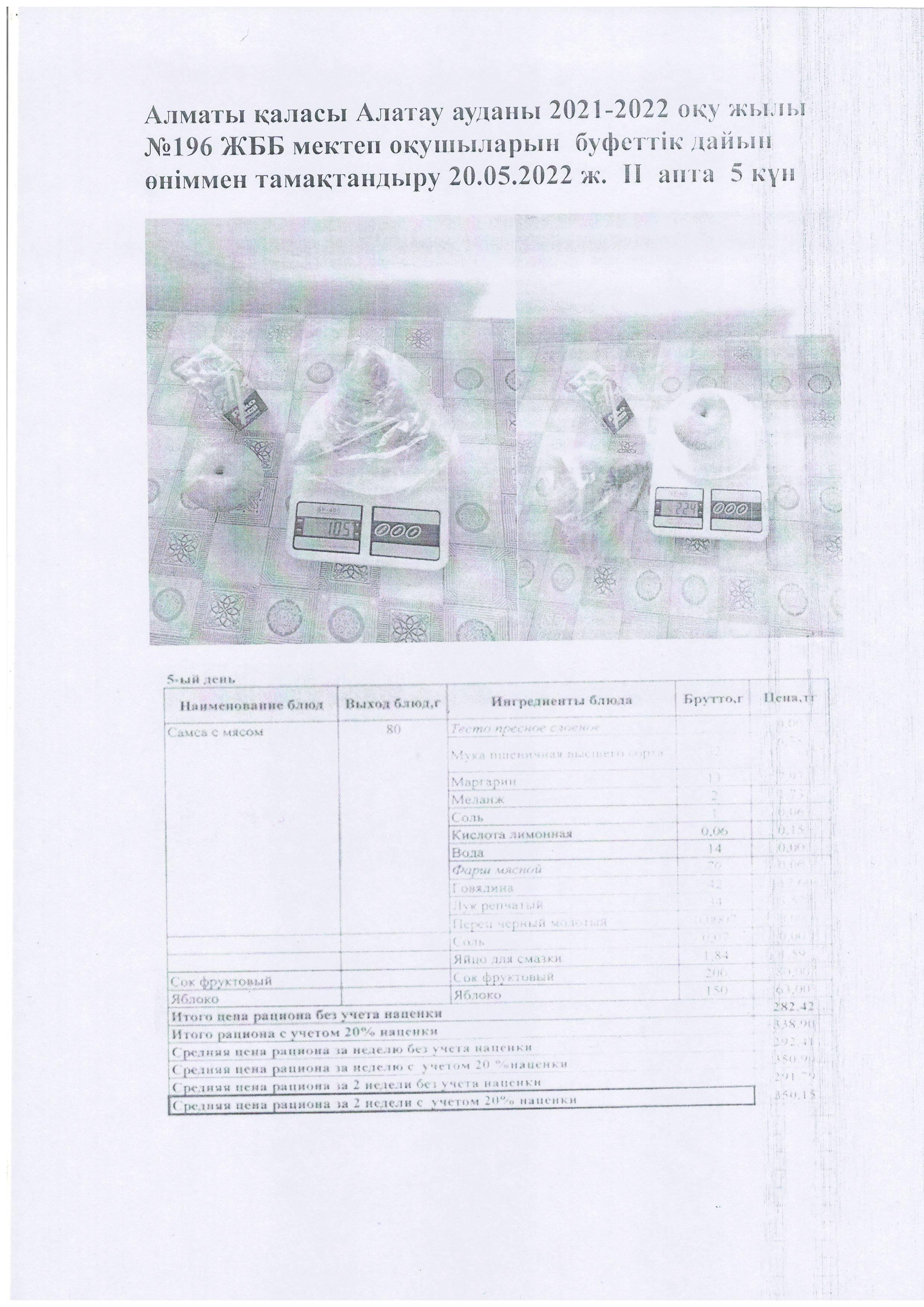 Алматы қаласы Алатау ауданы 2021-2022 оқу жылы №196 ЖББ мектеп оқушыларын буфеттік дайын өніммен тамақтандыру 20.05.2022 ж. ІІ апта 5 күн