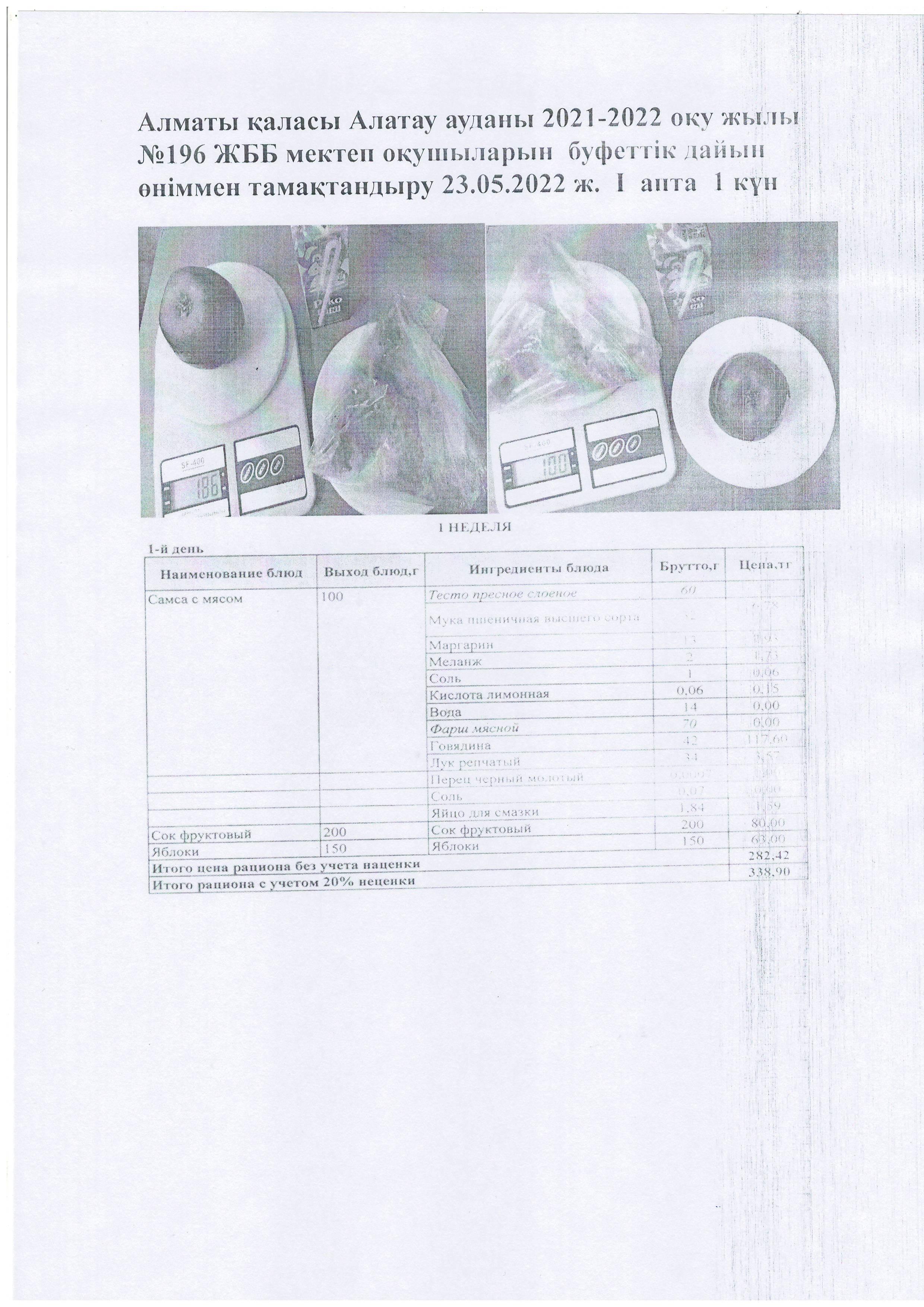 №196 мектеп » Тамақтандыру » Алматы қаласы Алатау ауданы 2021-2022 оқу жылы №196 ЖББ мектеп оқушыларын буфеттік дайын өніммен тамақтандыру 23.05.2022 ж. І апта 1 күн
